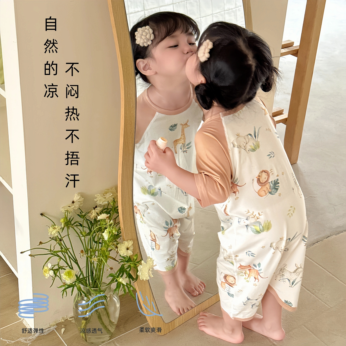 婧麒儿童莫代尔睡袍夏季宝宝空调服连体衣凉感睡衣男女童家居服