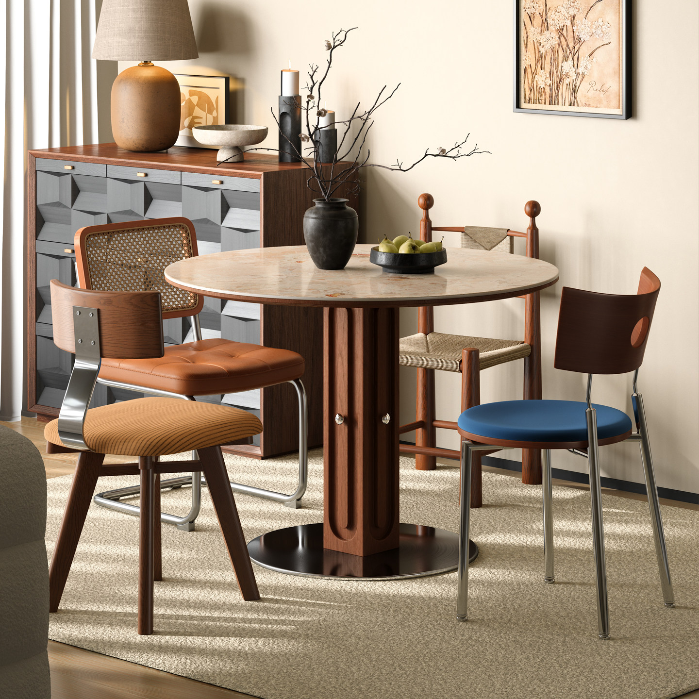 木小咖中古风洞石岩板餐桌圆桌家用小户型复古包豪斯圆形实木餐桌