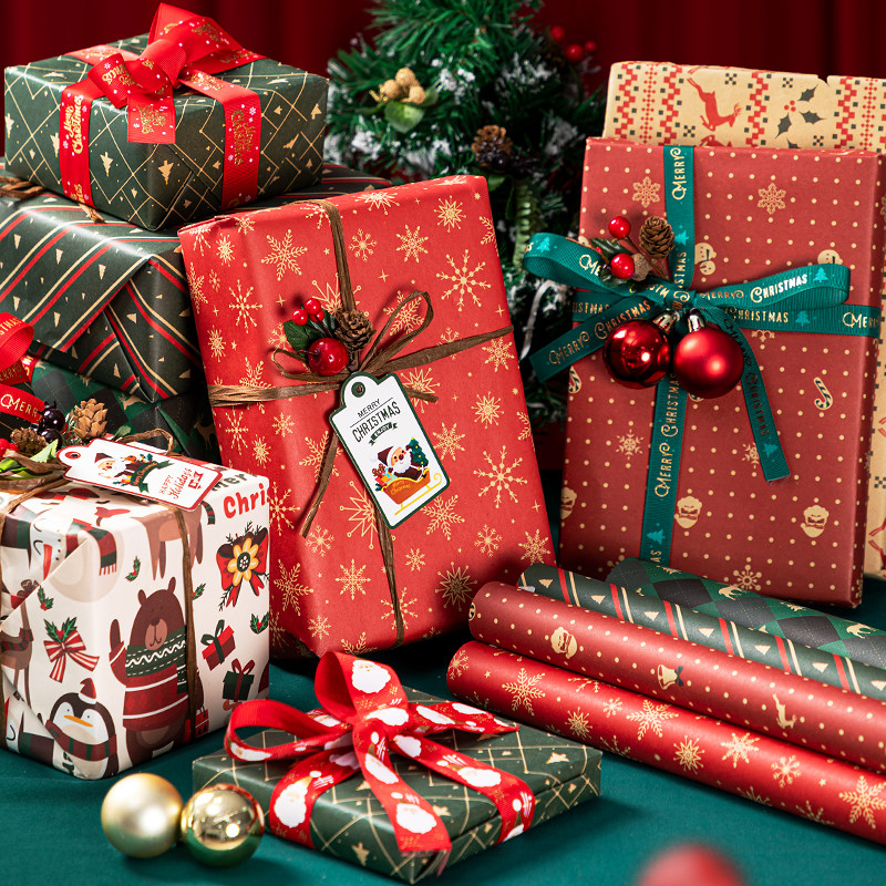 圣诞节苹果包装纸礼物牛皮纸生日礼品纸高级感超大尺寸礼盒纸男生加丝带儿童可爱复古红色打包材料彩纸花纸包