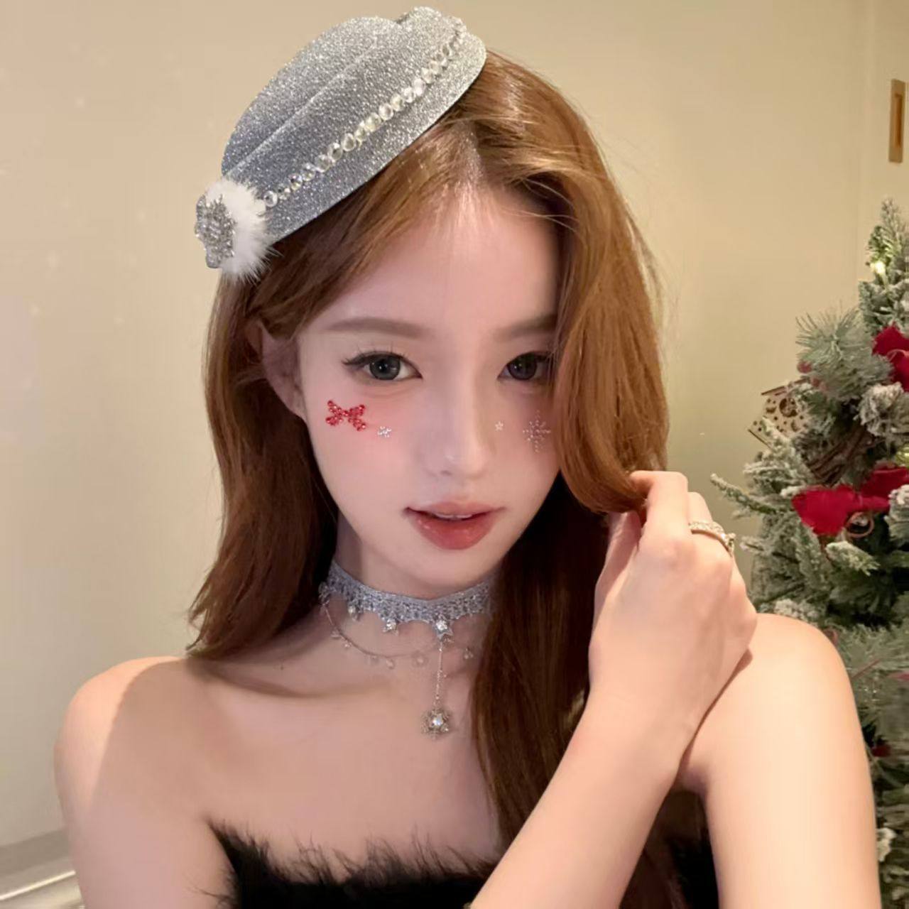 JUNWEI 冰雪精灵 闪钻银色雪花小礼帽发夹女圣诞节cos穿搭头饰