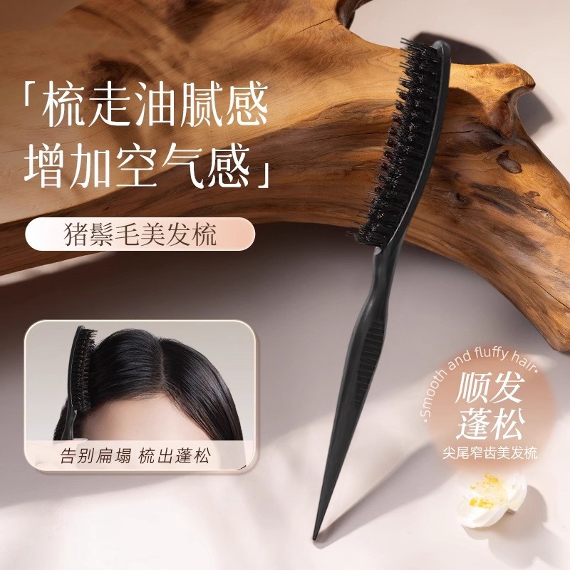 猪鬃毛窄齿梳美发三排打毛梳子蓬松造型长柄化妆尖尾盘发卷发木梳