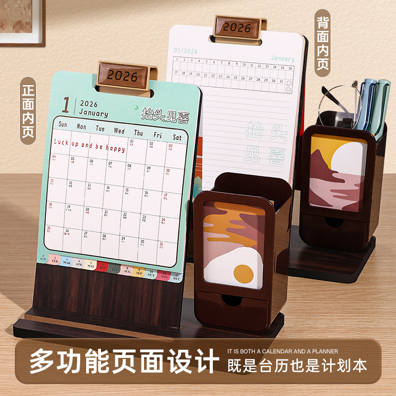2026年新款日历亚克力多功能活页笔筒台历桌面创意摆件办公室商务打卡日程记事马年翻页月历企业广告印刷定做