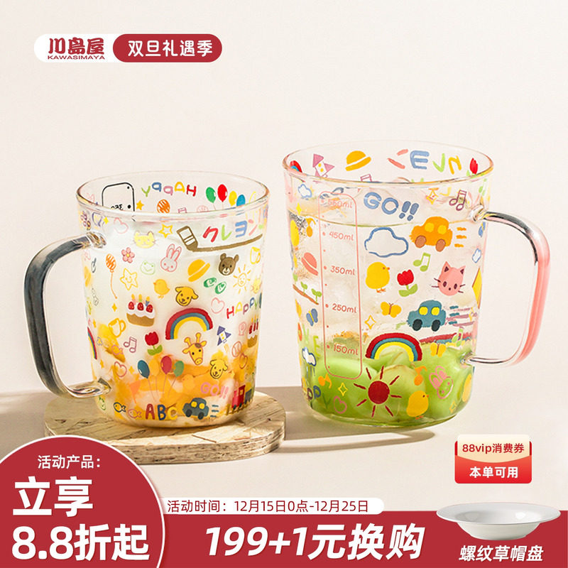 川岛屋高硼硅玻璃杯子家用儿童水杯耐高温刻度牛奶杯微波炉可加热