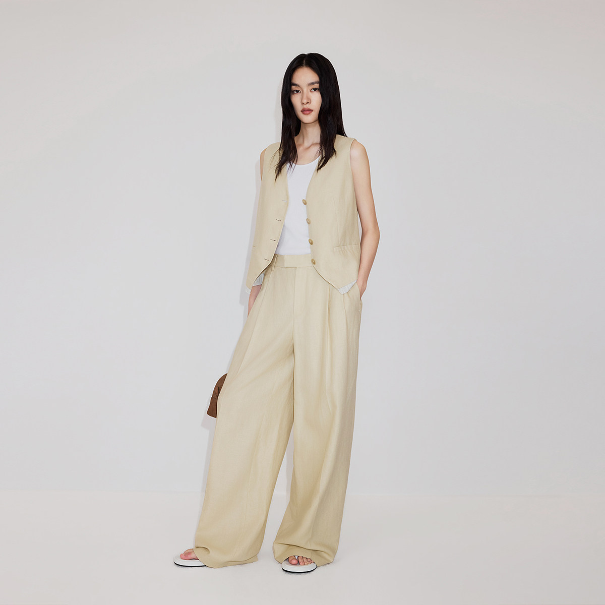 【新品】OCHIRLY欧时力棉麻阔腿西装长裤超模裤宽松直筒2026春夏*