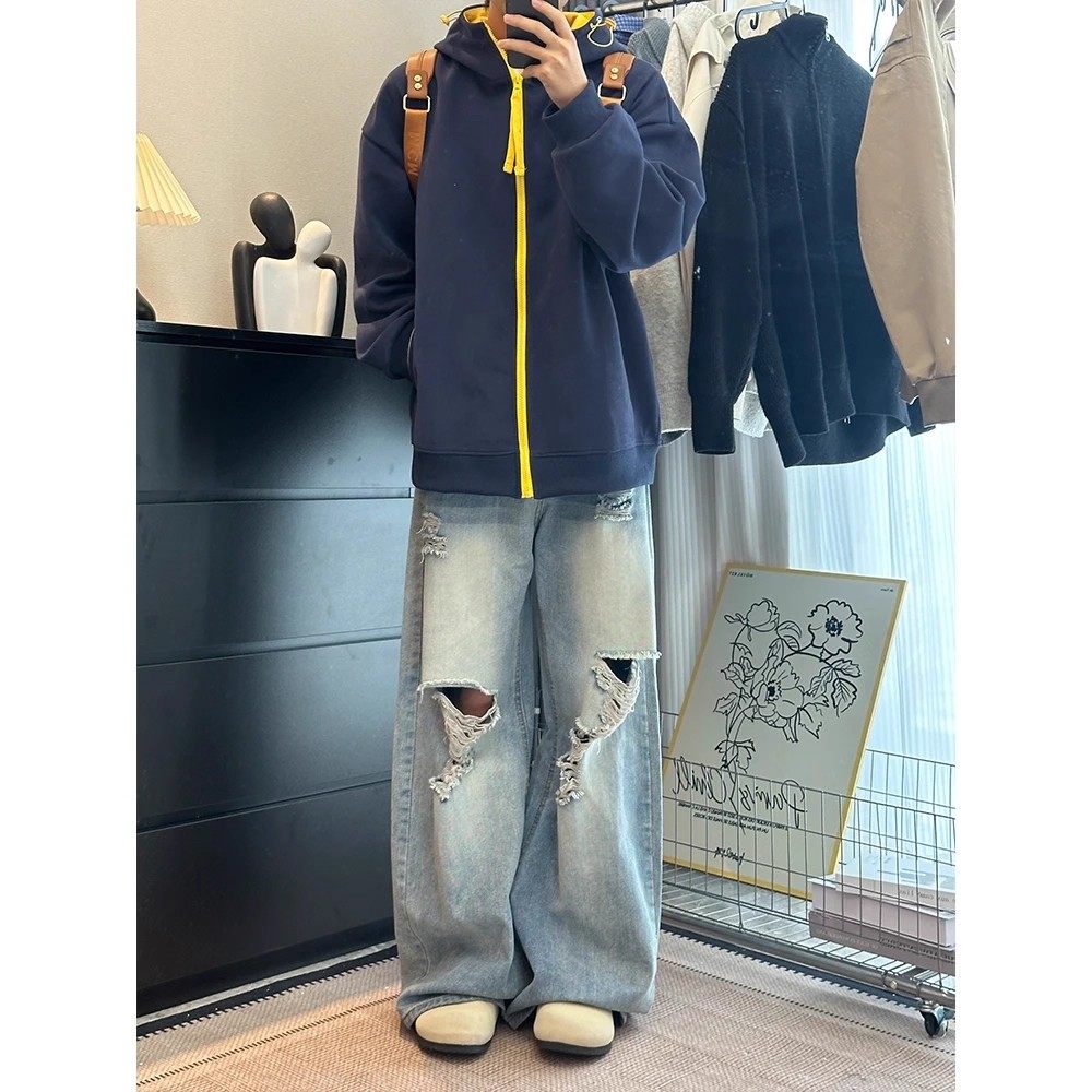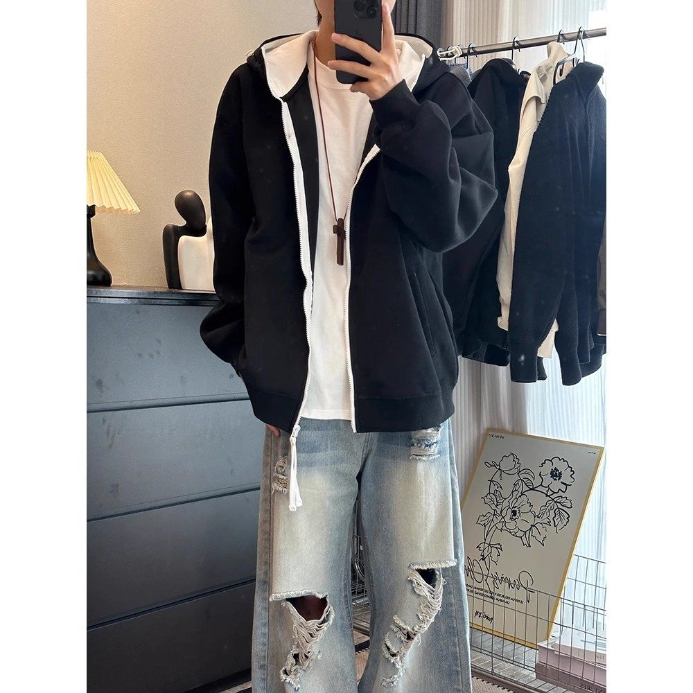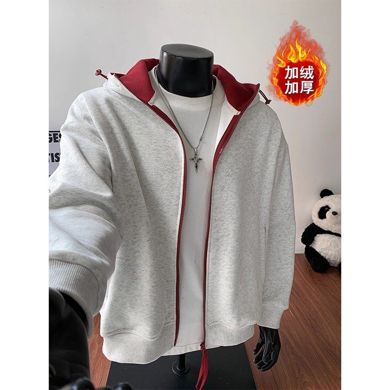 美式运动风连帽开衫卫衣男款秋冬季复古撞色拼接宽松加绒上衣外套