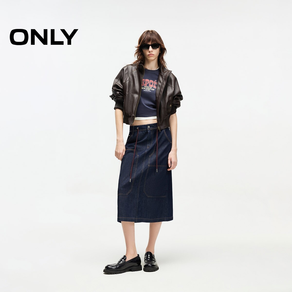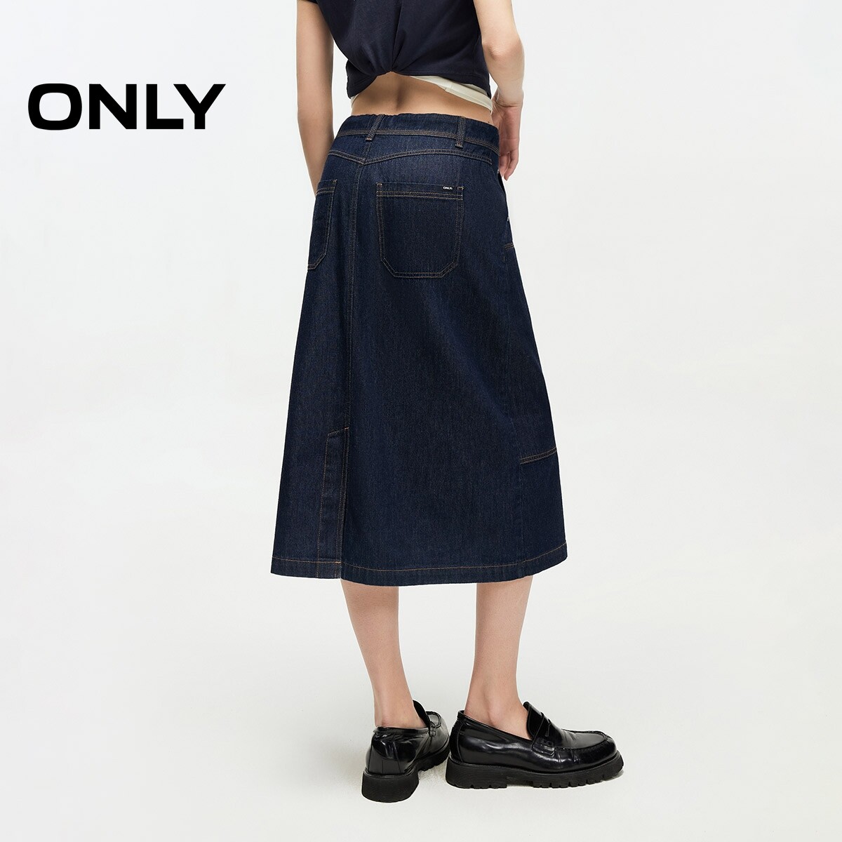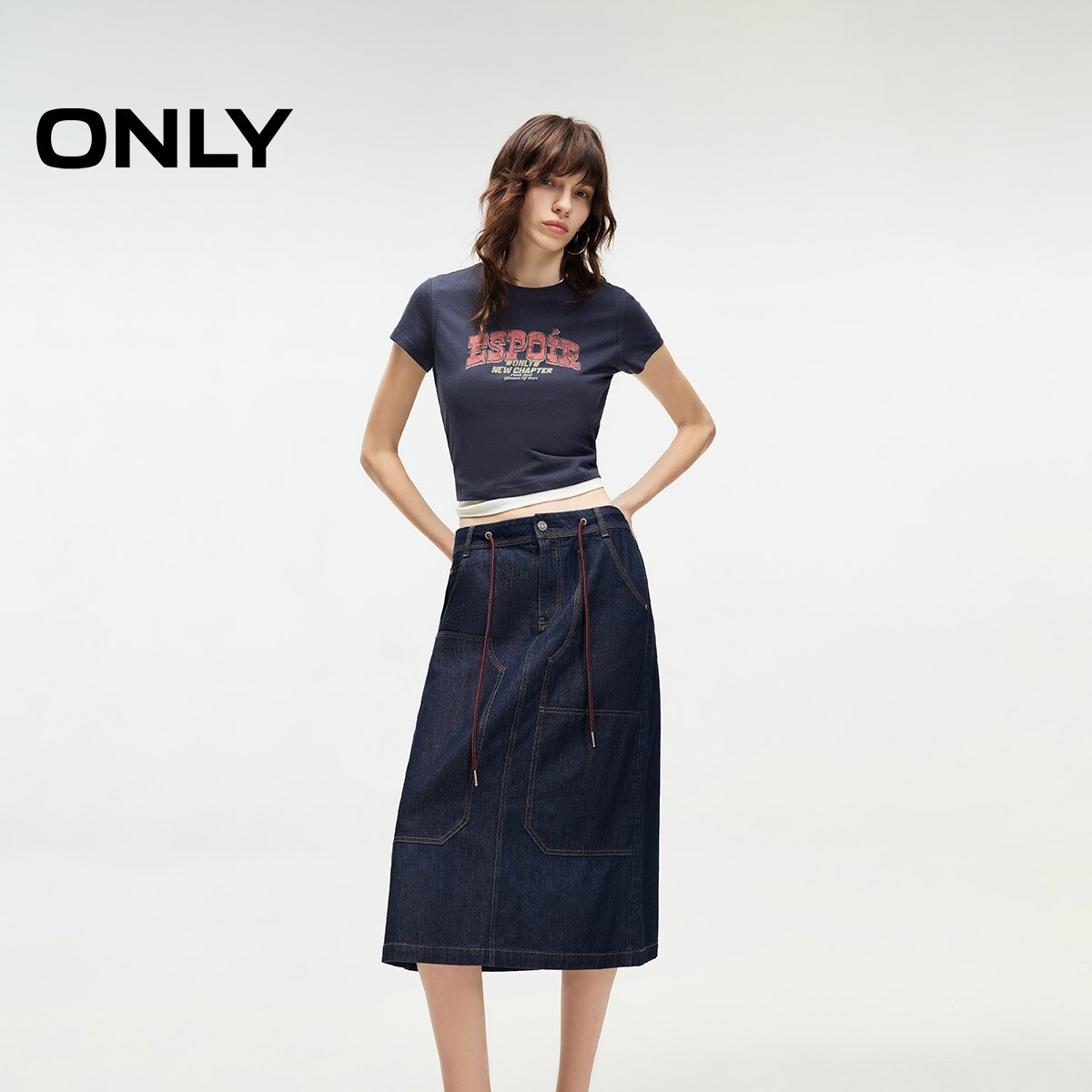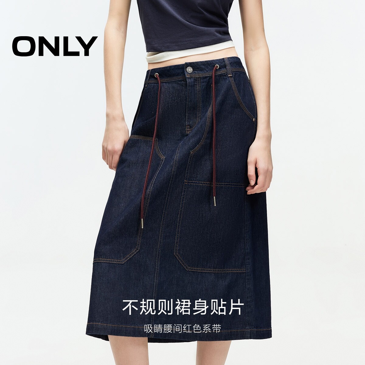 【ONLY奥莱】春款纯棉腰间系带下摆开衩A字中长裙牛仔半身裙女