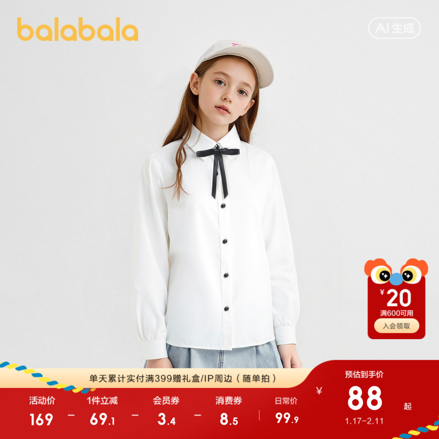 学院风女童白衬衫,赠皮质蝴蝶结发饰