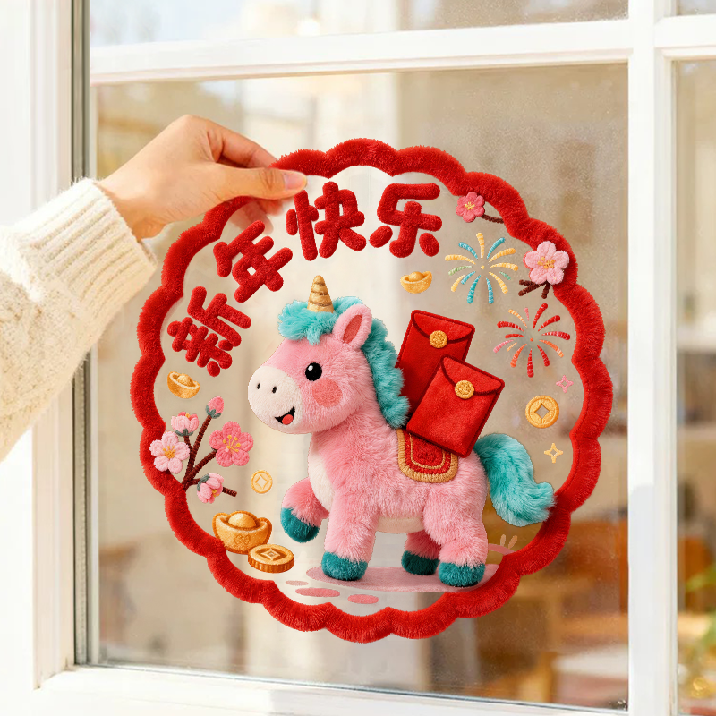 2026新年马年5D春联窗花毛绒效果静电玻璃橱窗贴纸春节窗花新年贴