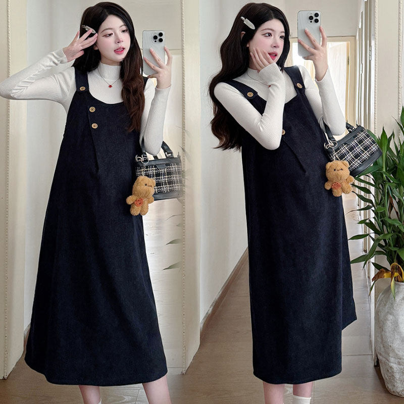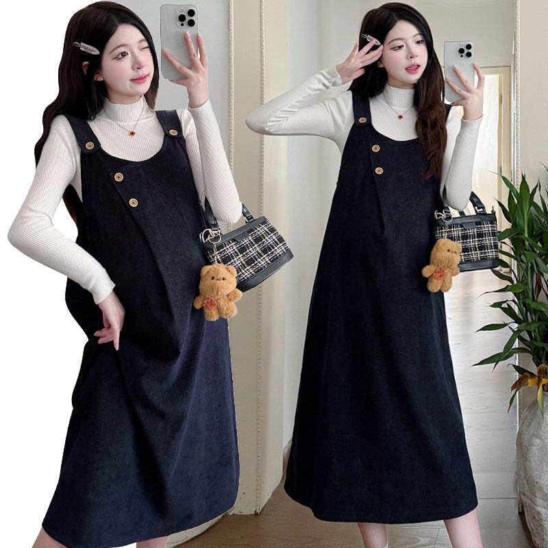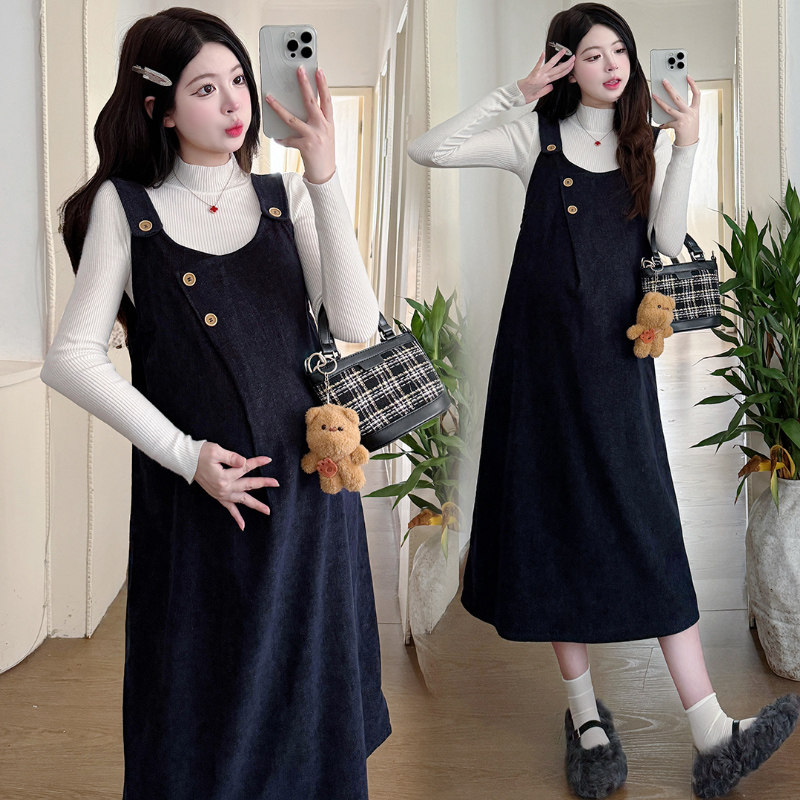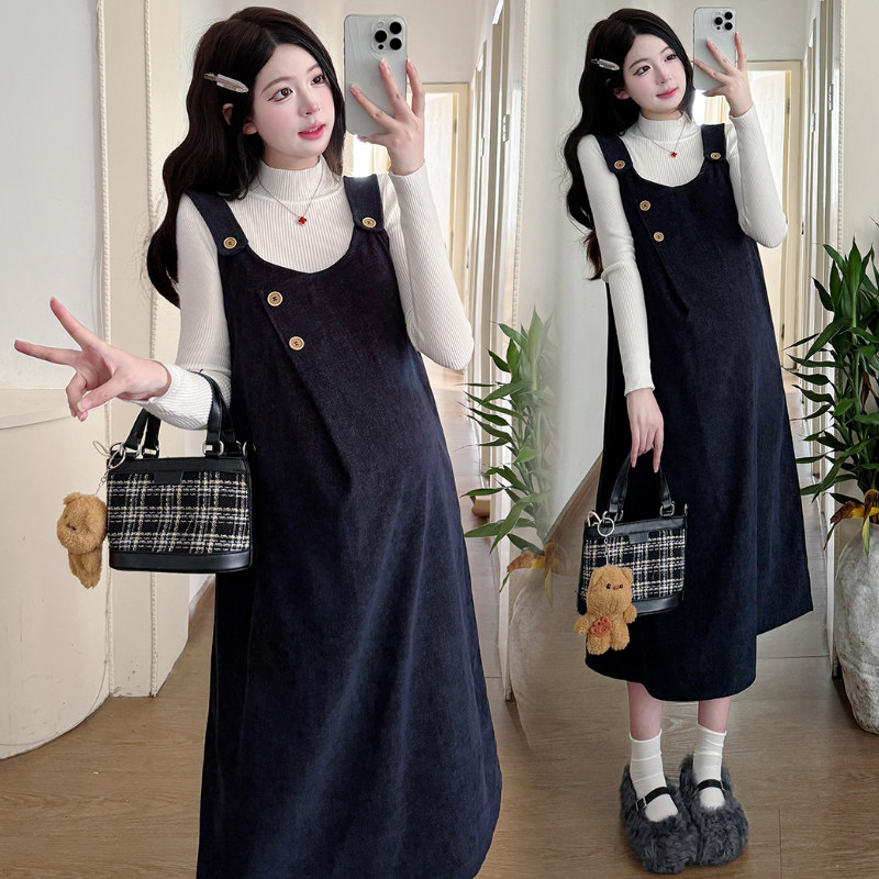 婧麒法式假两件针织孕妇连衣裙女长袖高领显瘦气质长裙女舒适套装