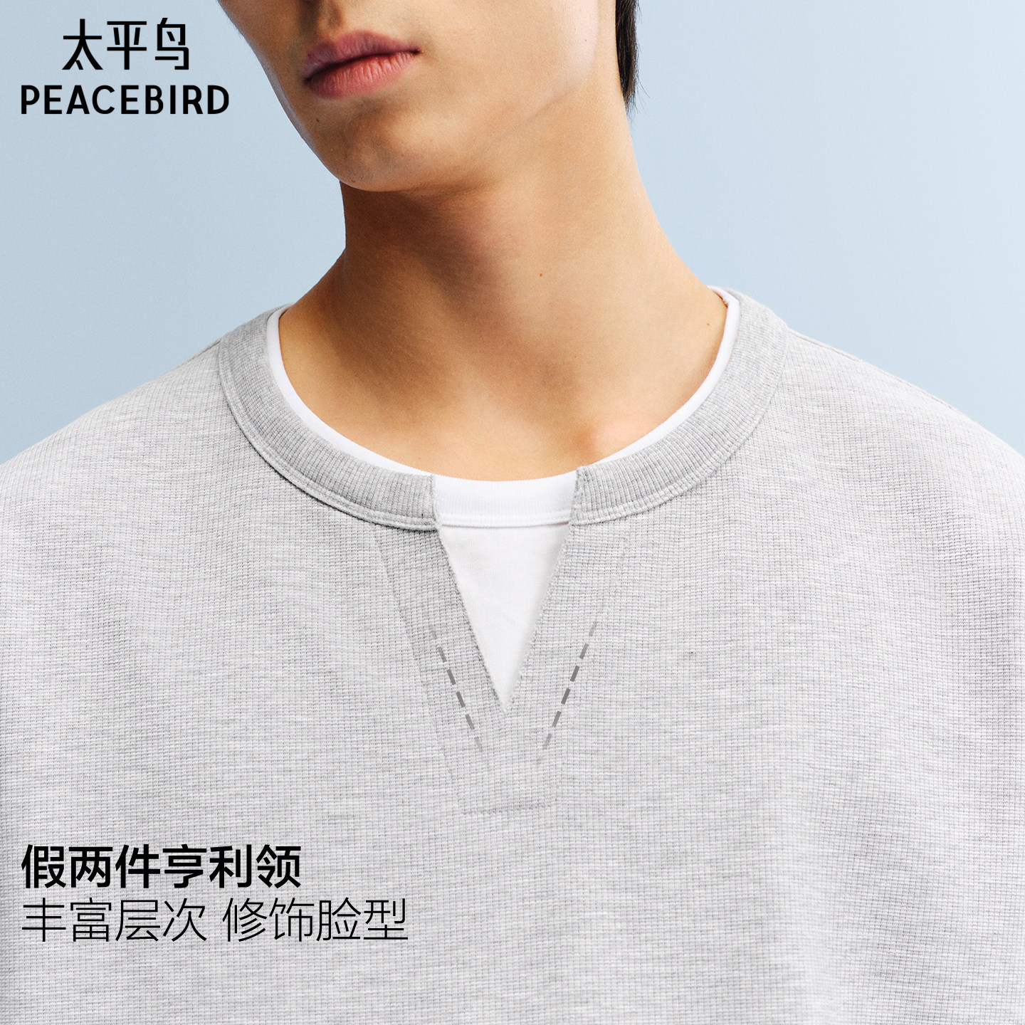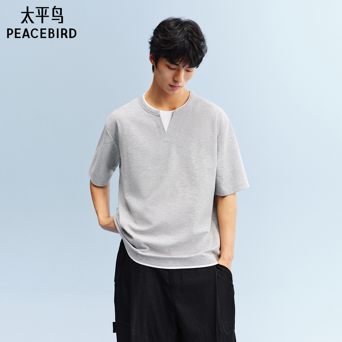 【亨利领】太平鸟男装重磅华夫格短袖T恤夏新款老钱风假两件体恤