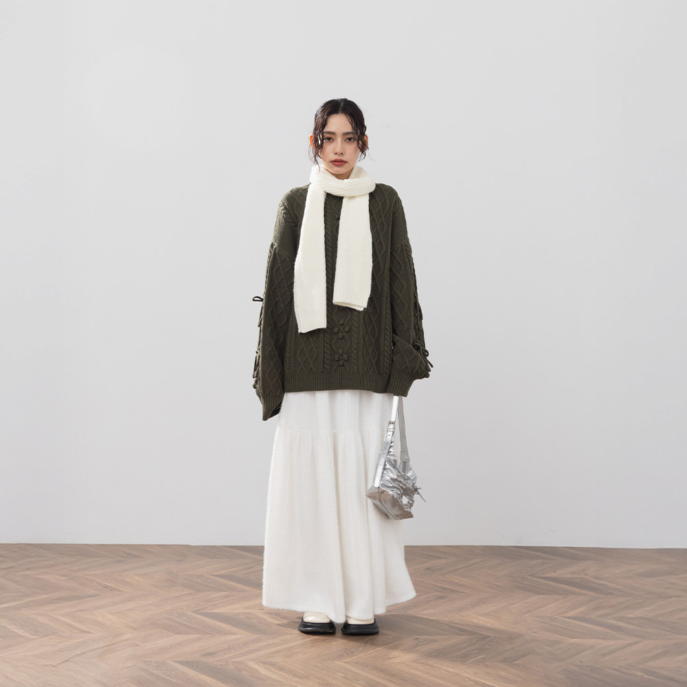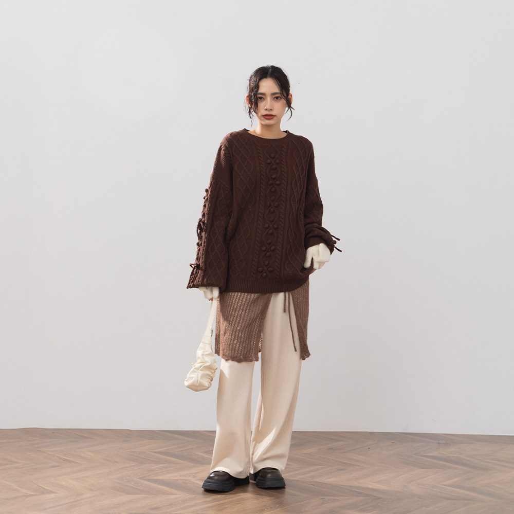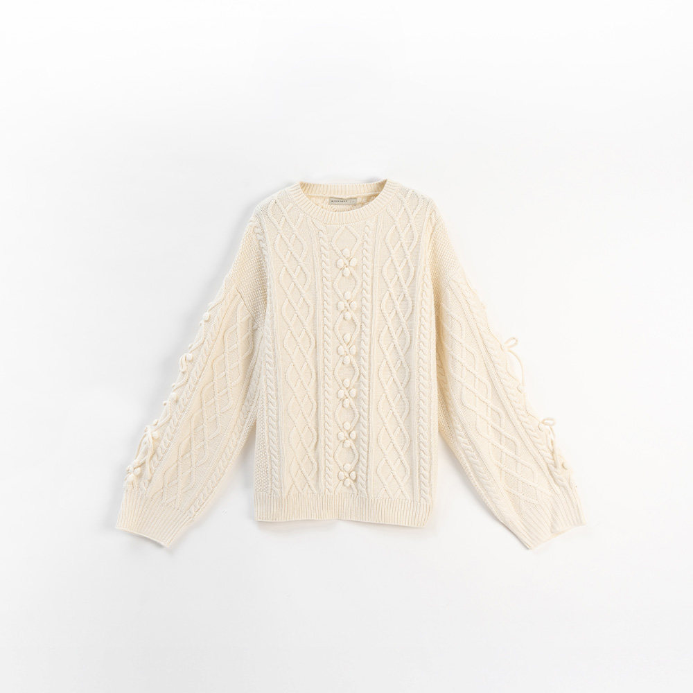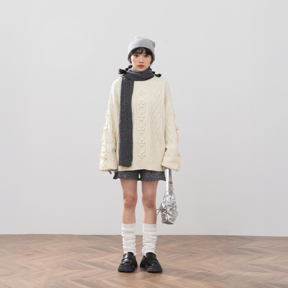 QUEENSHOP 2025秋冬新品女装立体蝴蝶结小球麻花针织毛衣01013508