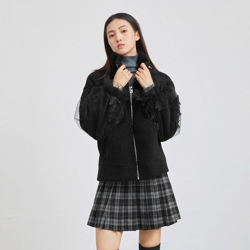【秒杀】sdeer圣迪奥女装立领网纱绣花摇粒绒外套S224Z2203