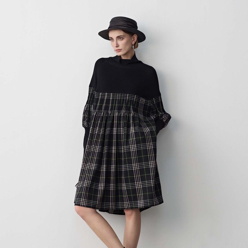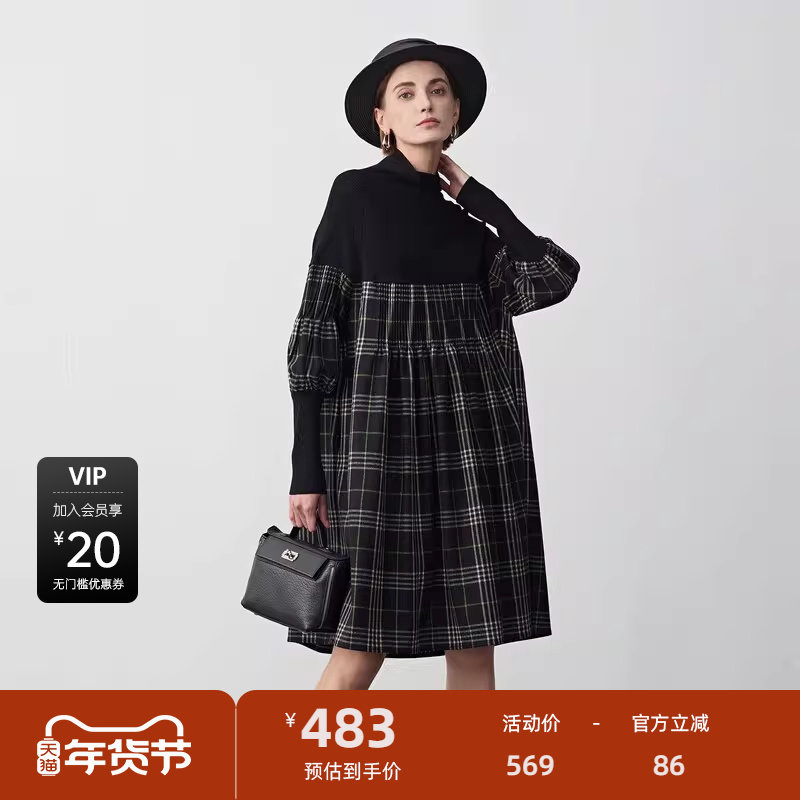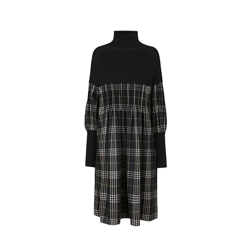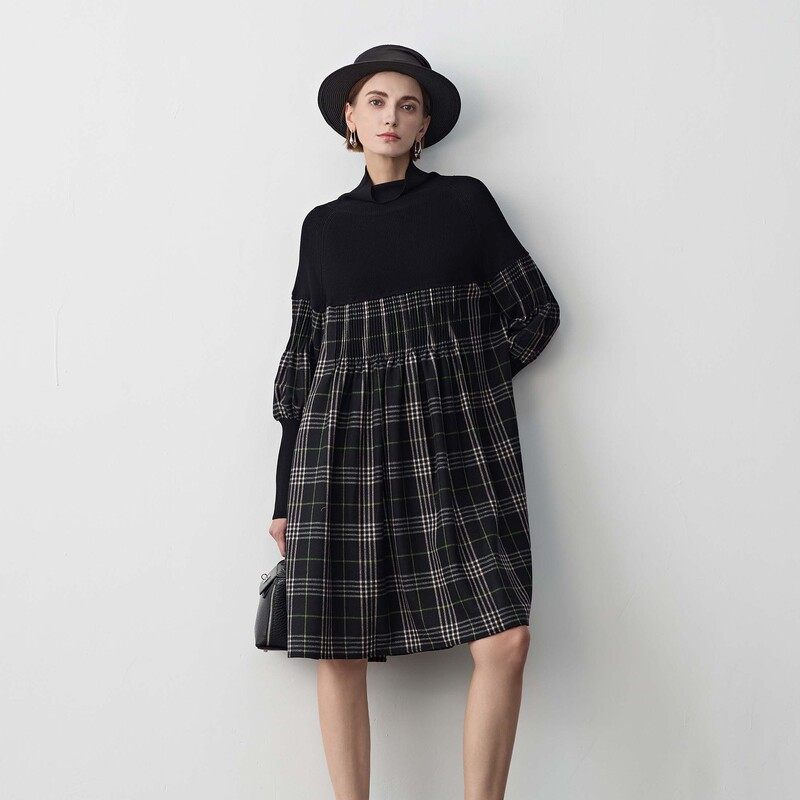 sdeer圣迪奥女装罗纹高领格纹碎褶长袖连衣裙S23481206