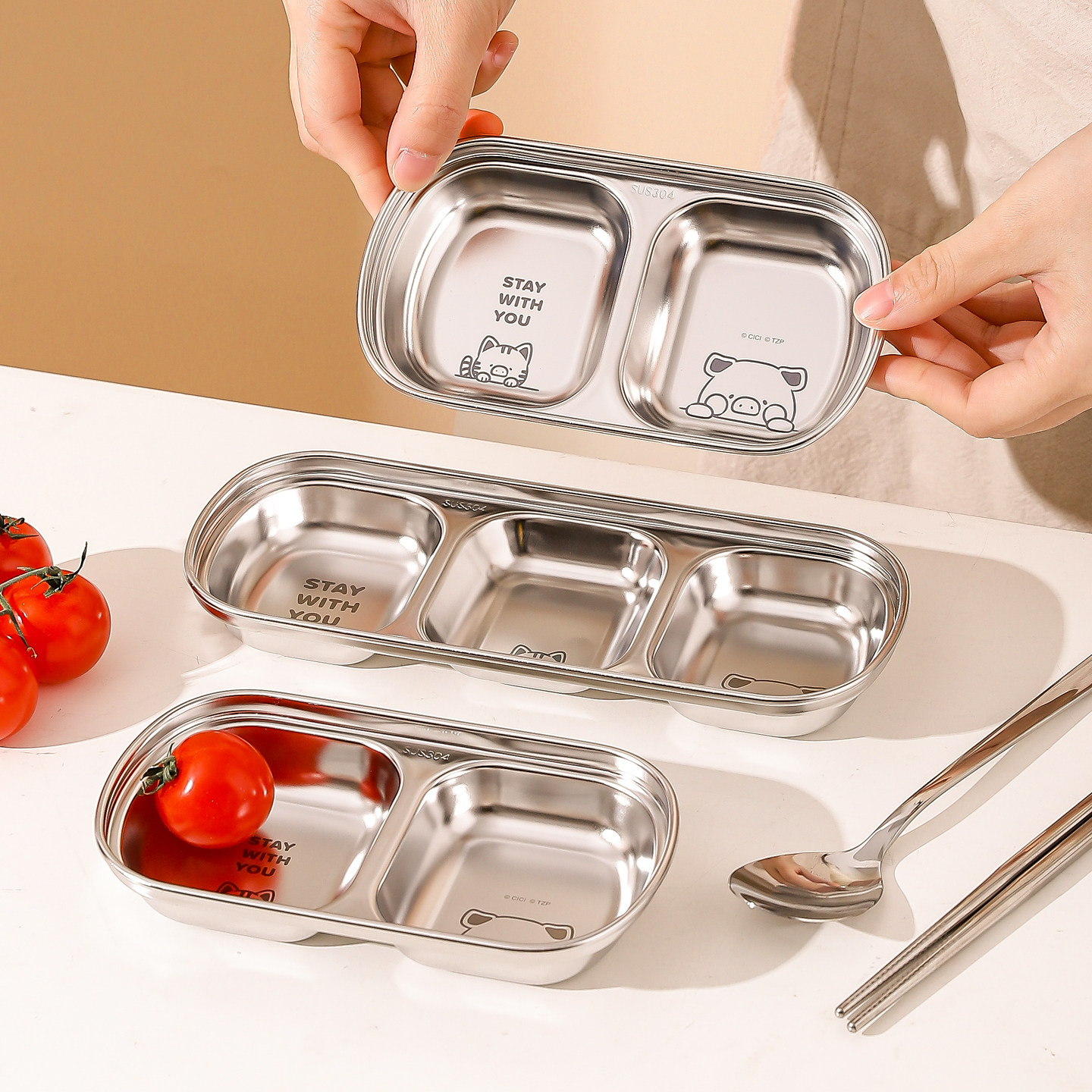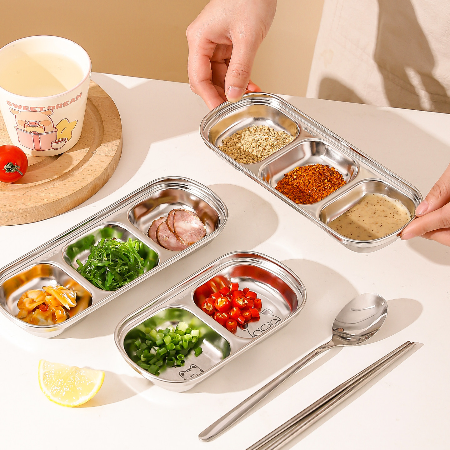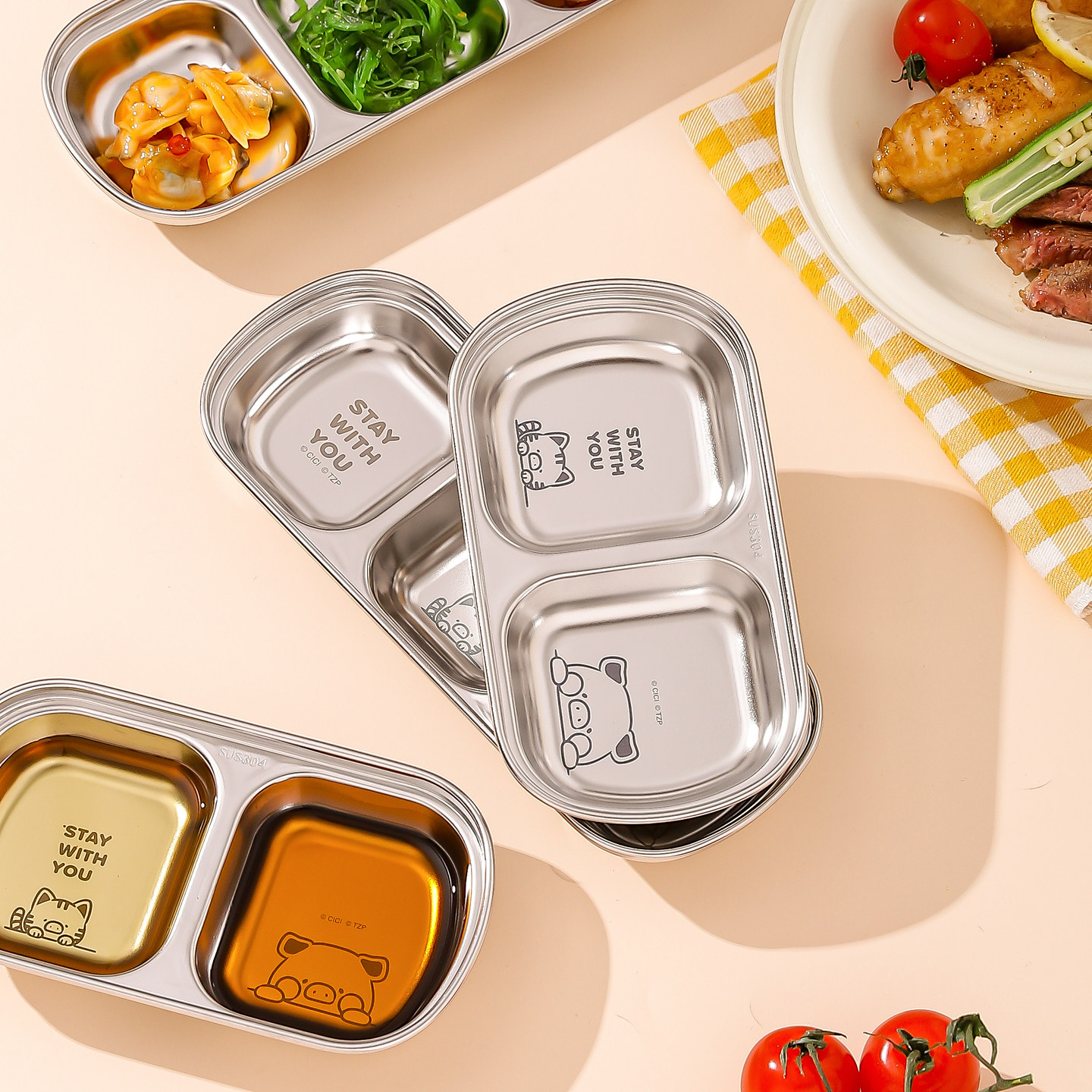 川岛屋&lulu猪联名 不锈钢烤肉蘸料碟子分格调味调料碟泡菜蘸酱盘