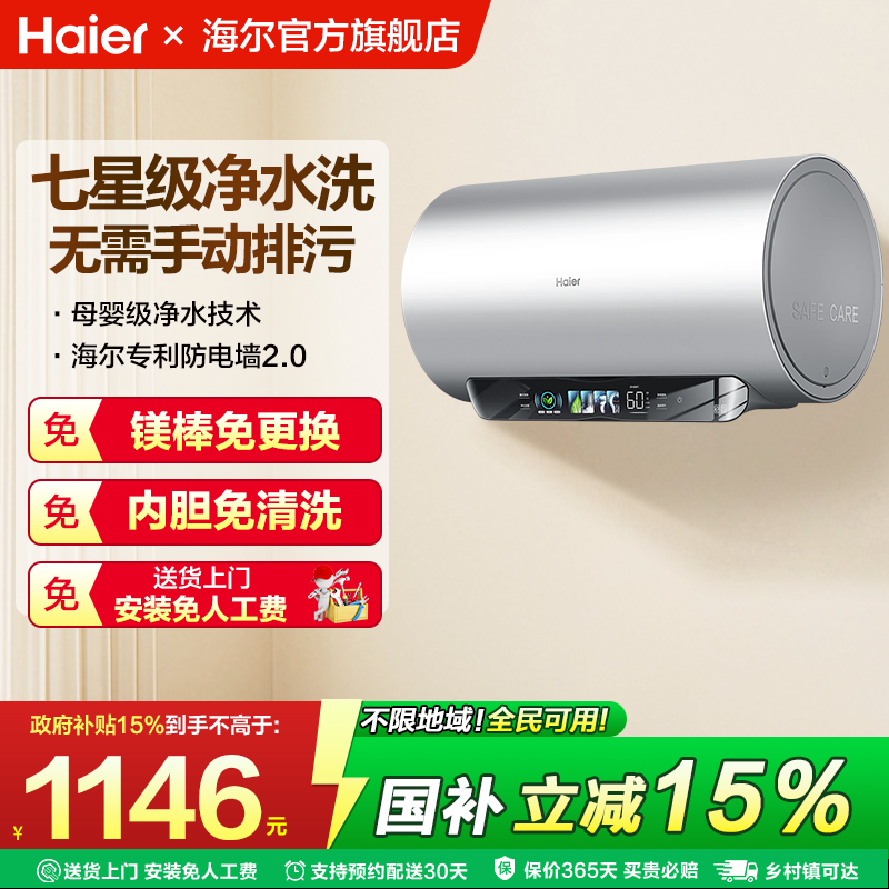 国补海尔电热水器家用60升一级能效变频卫生间洗澡镁棒免换免清洗