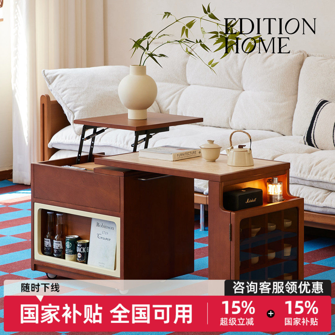 editionhom奥拉升降旋转实木岩板茶几家用客厅小户型移动沙发边几