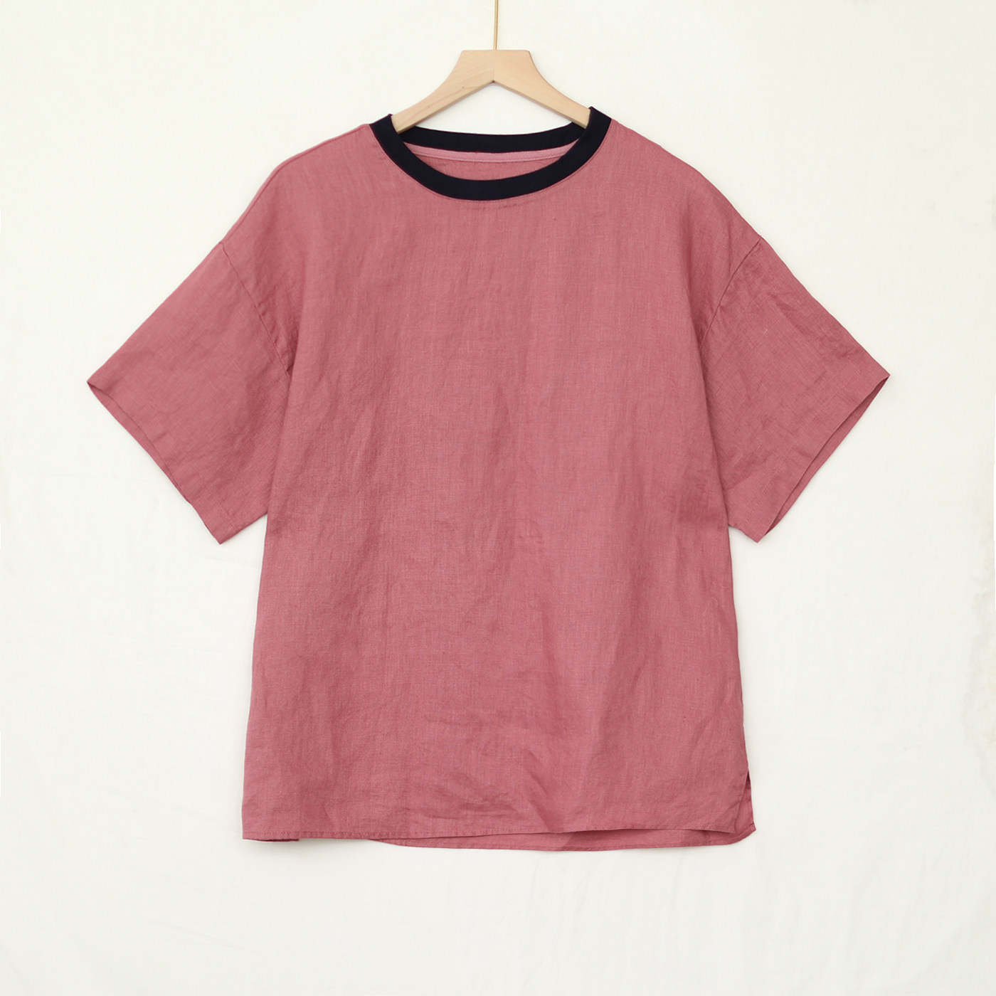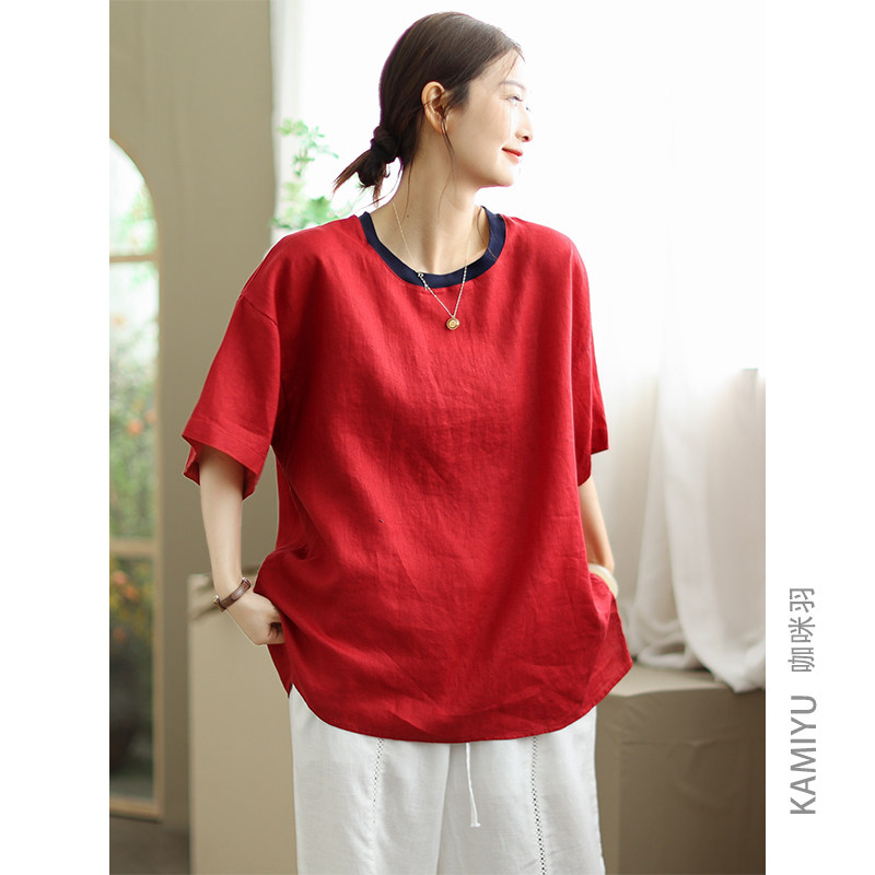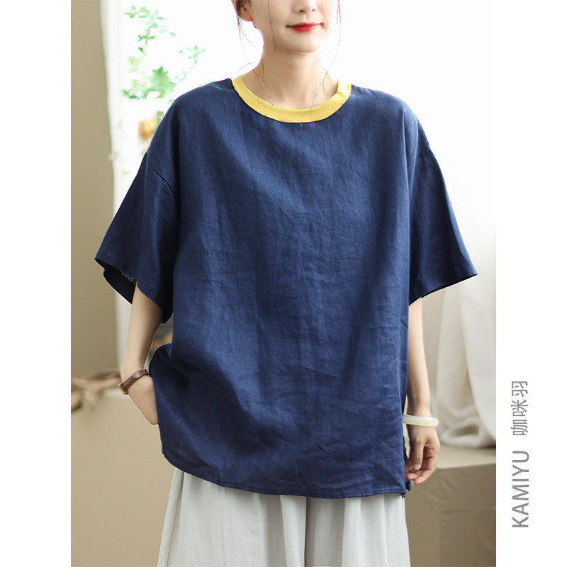 咖咪羽衬衫女夏季新款圆领文艺原创女式上衣宽松拼接亚麻女装T恤