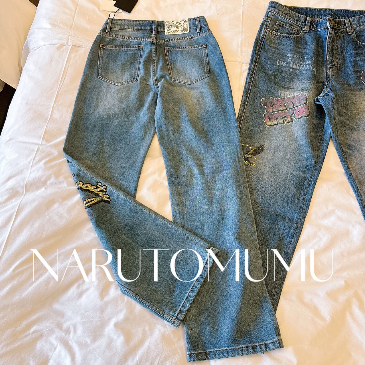 IMXS【明星同款】蕾丝印花牛仔裤脏脏复古微喇阔腿休闲长裤2025年