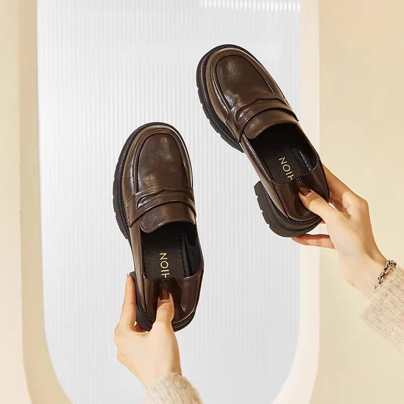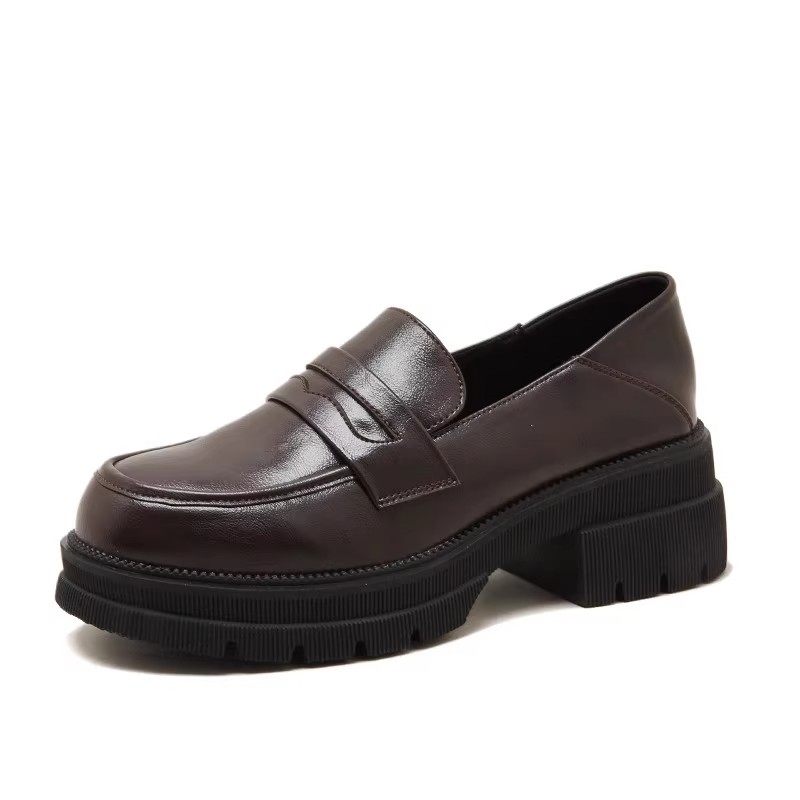 时尚复古2025新款粗跟厚底英伦风软皮乐福鞋5.5cm防滑