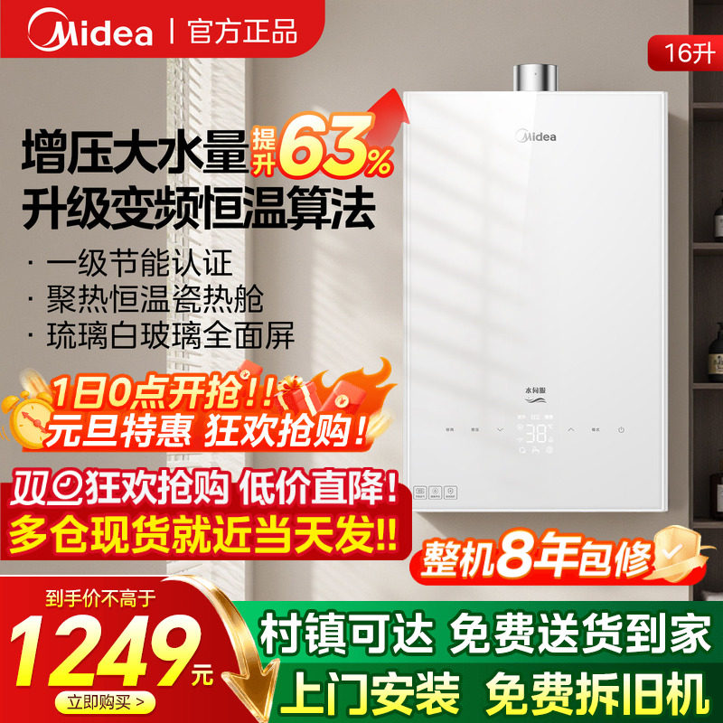 美的燃气热水器16升家用天然气恒温零冷水增压水伺服MK6A白色玻璃