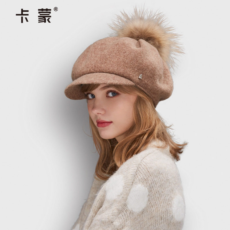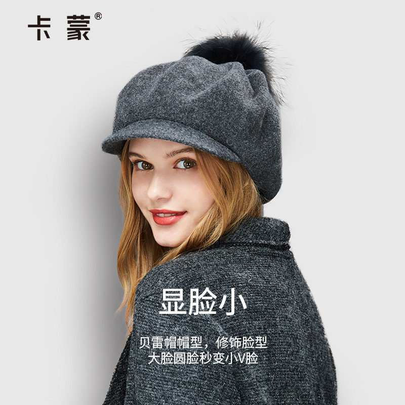 卡蒙貉子毛球纯羊毛呢可爱画家帽女百搭亲肤加绒保暖八角贝雷帽