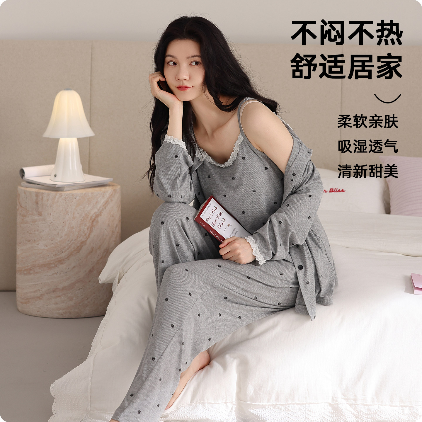 都市丽人吊带睡衣女三件套春秋高级感长袖带胸垫可外穿家居服套装