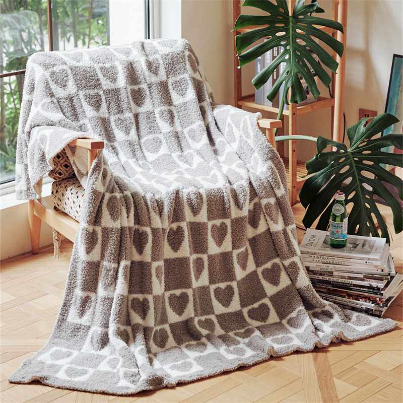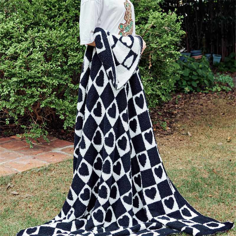超火的爱心复古大棋盘格半边绒针织线毯沙发毯桃心