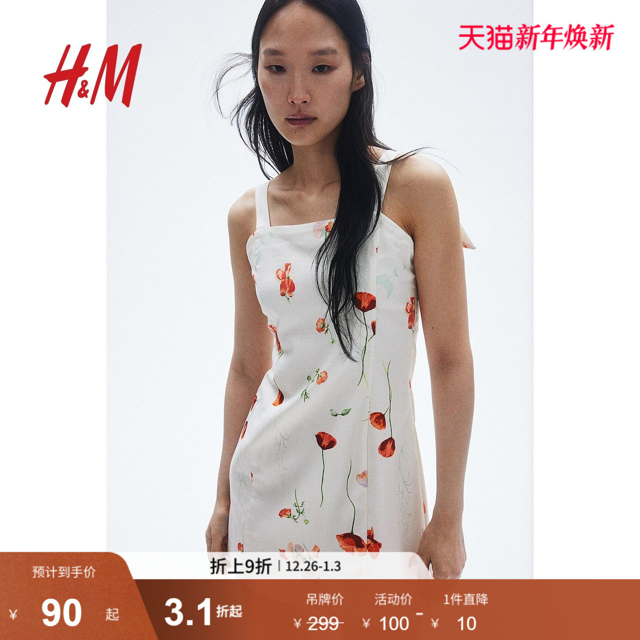 HM女装无领连衣裙冬季修身方领气质A字印花吊带度假风短裙1231202