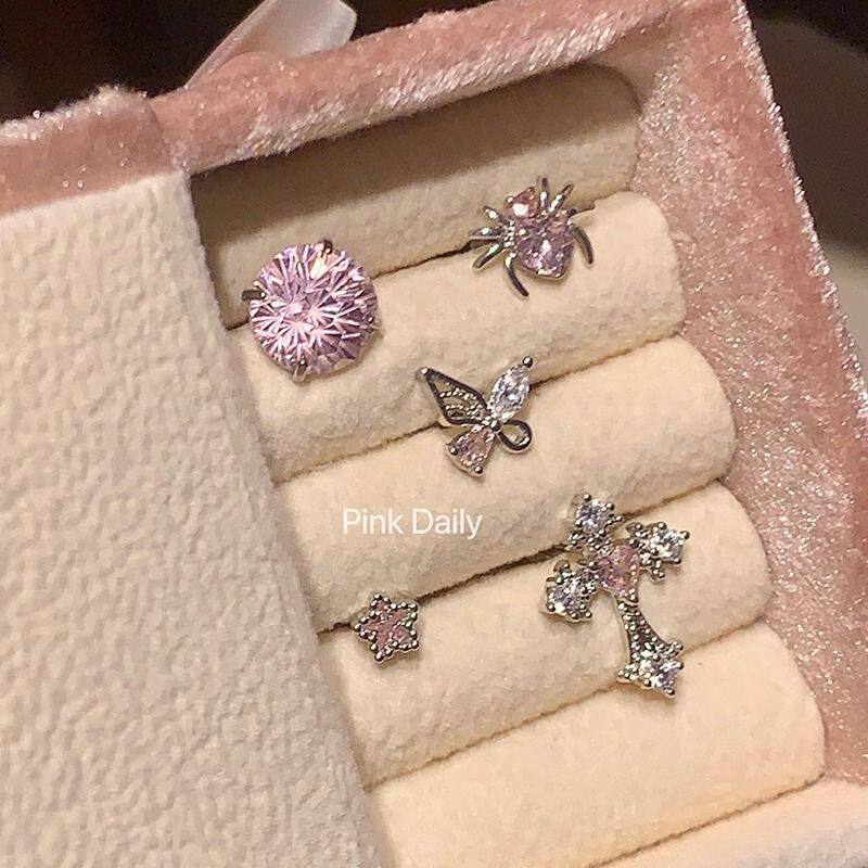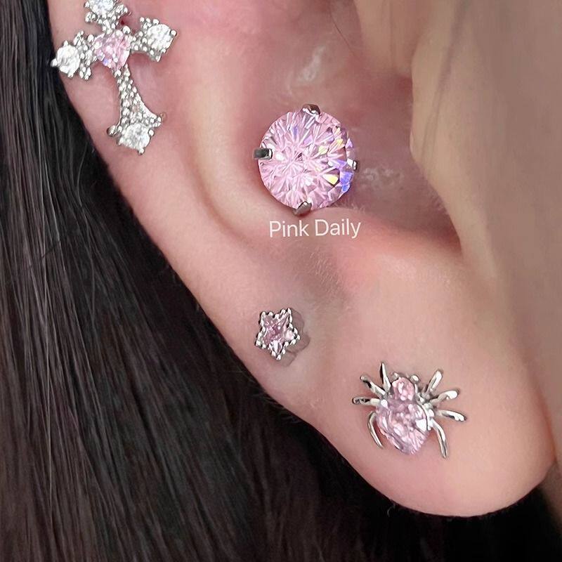 s999足银耳钉女轻奢设计粉色锆石耳饰礼物养耳洞钛钢十字架蜘蛛
