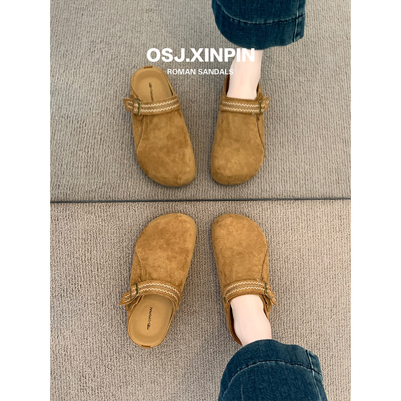 真皮包头拖秋季2025年新款勃肯鞋圆头拖鞋平底外穿休闲半拖懒人鞋