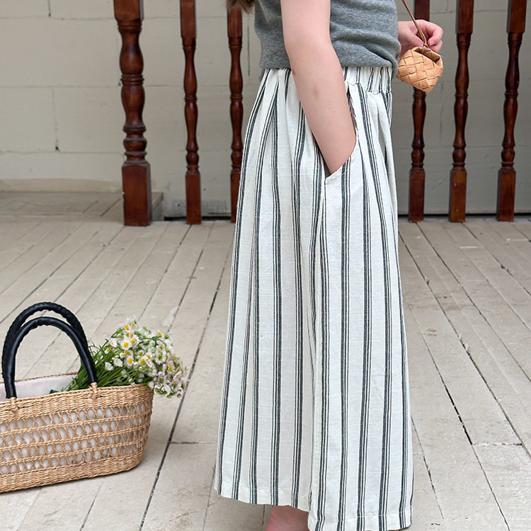 儿童休闲度假风9分裤宽松直筒裤2025夏女童柔软棉麻条纹阔腿裤潮