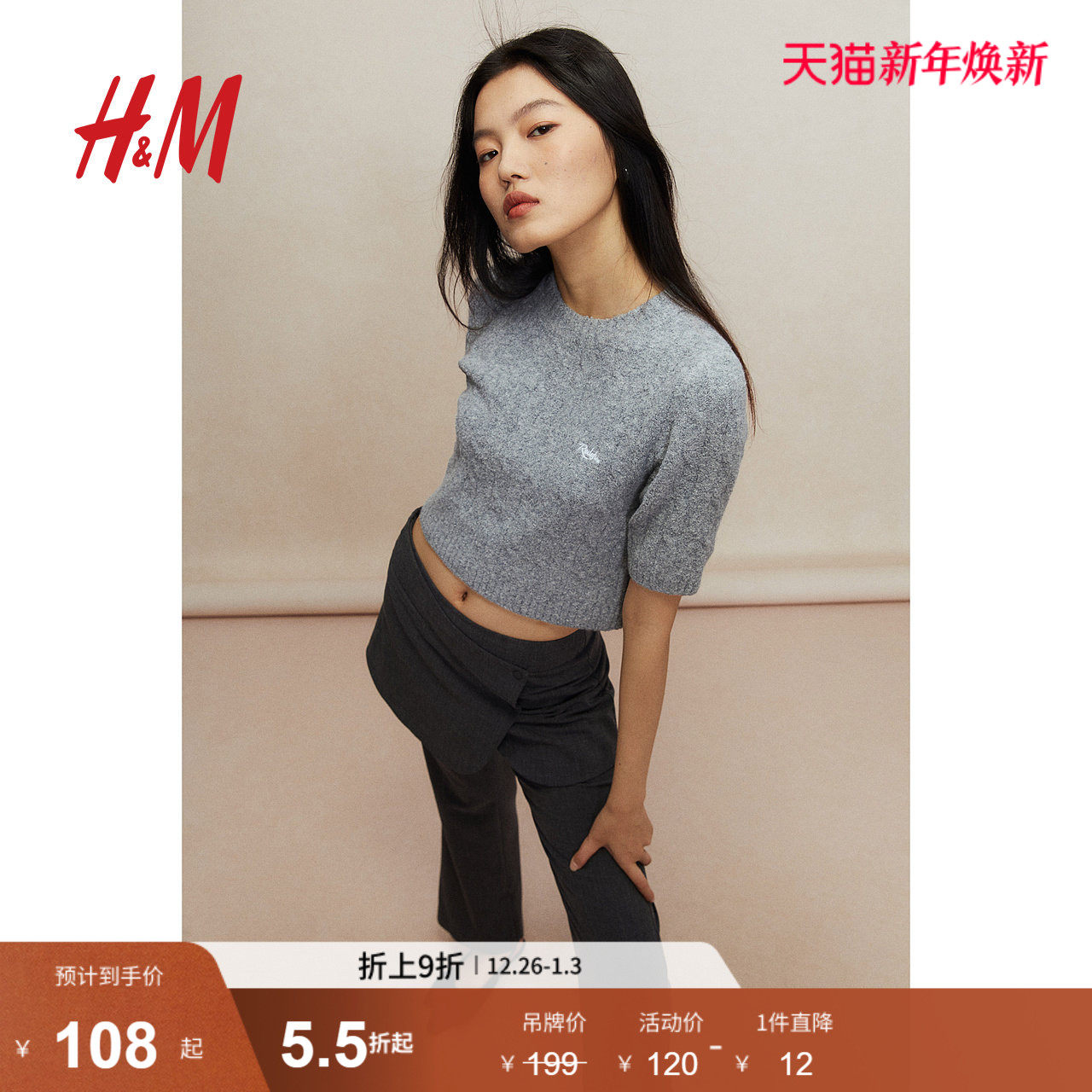 HM女装毛针织衫春季修身舒适柔软针织短袖毛衣1254928
