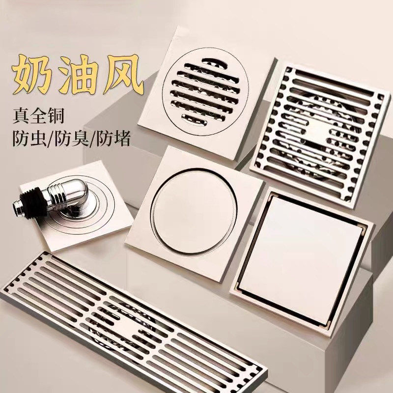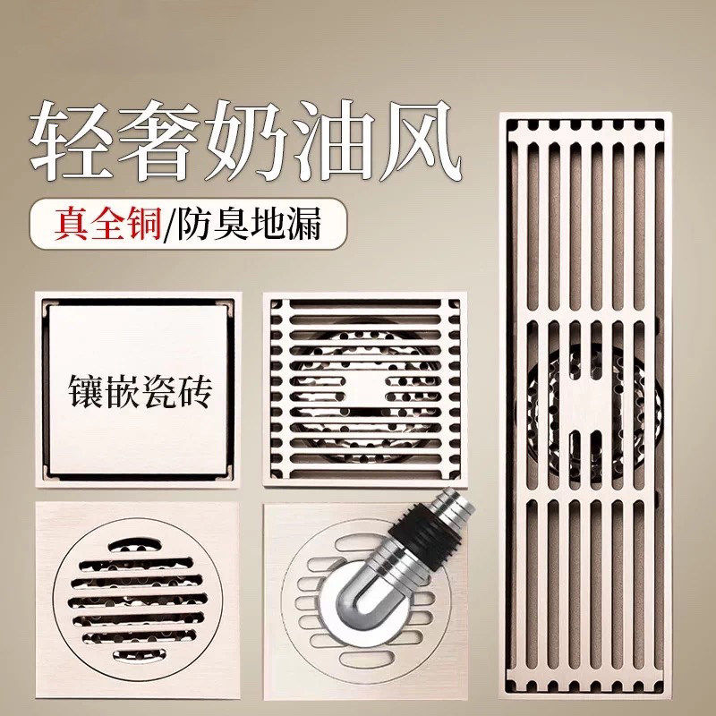 奶油风全铜拉丝地漏防臭洗衣机厨房卫生间黄铜隐形排水防虫下水管