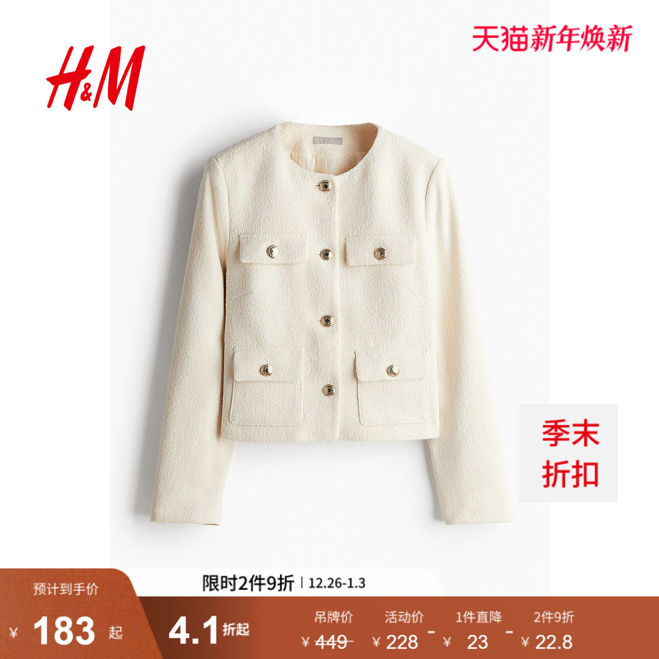 HM女装外套秋季新款纹理编织廓形粗花呢小香风外套外套1241437