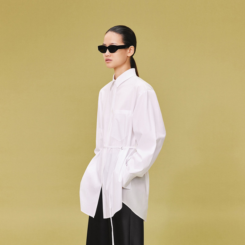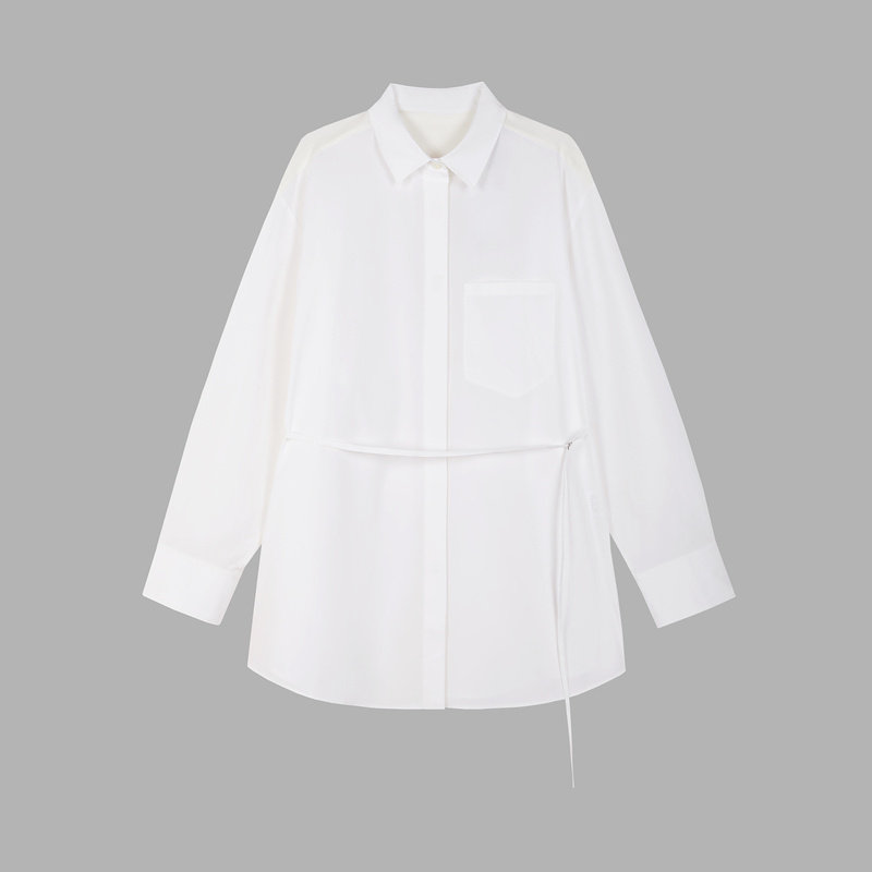 LESS白色长袖衬衫女暗门襟设计长款阔版宽松衬衣送腰带2O4210330
