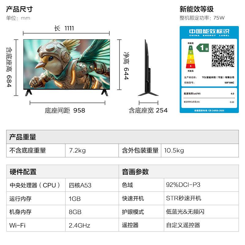 雷鸟雀4 25款50英寸高色域莱茵护眼智能电视以旧换新补贴50F196C