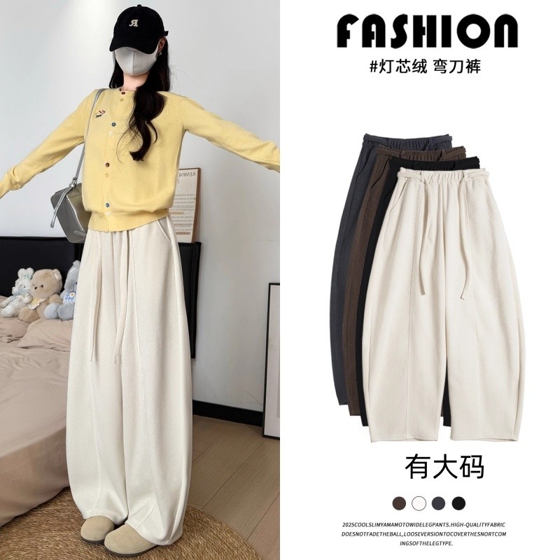 米白色灯芯绒弯刀裤女2025秋冬加绒宽松慵懒山本阔腿裤大码小个子