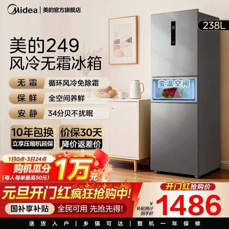 美的249三门冰箱风冷无霜大容量变频一级能效家用小型宿舍租房