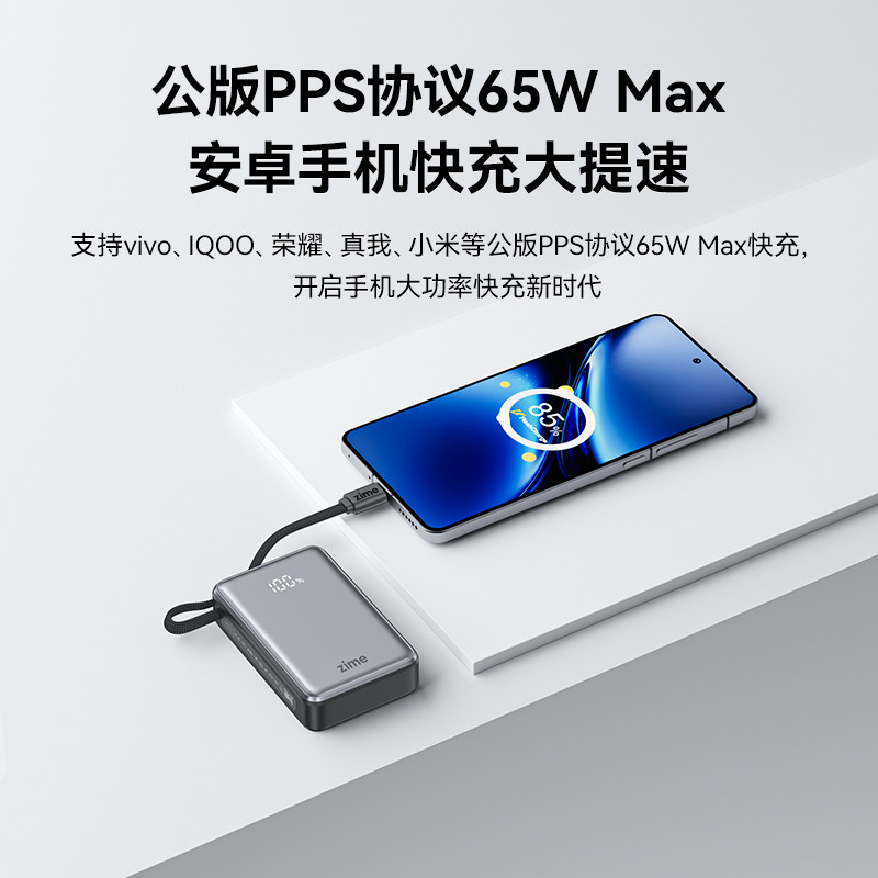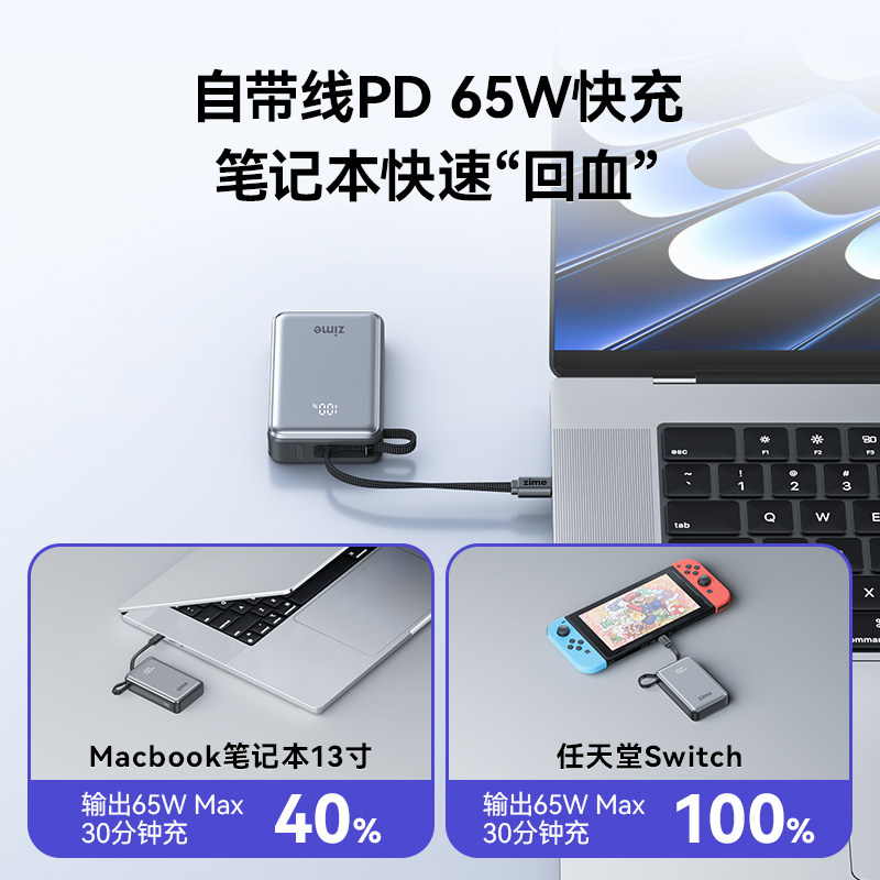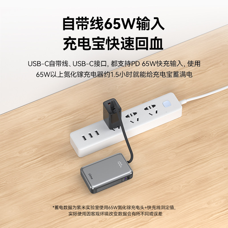 【3C认证可上飞机】紫米65W大功率充电宝20000毫安自带线PD超级快充适用华为苹果笔记本电脑Switch2移动电源