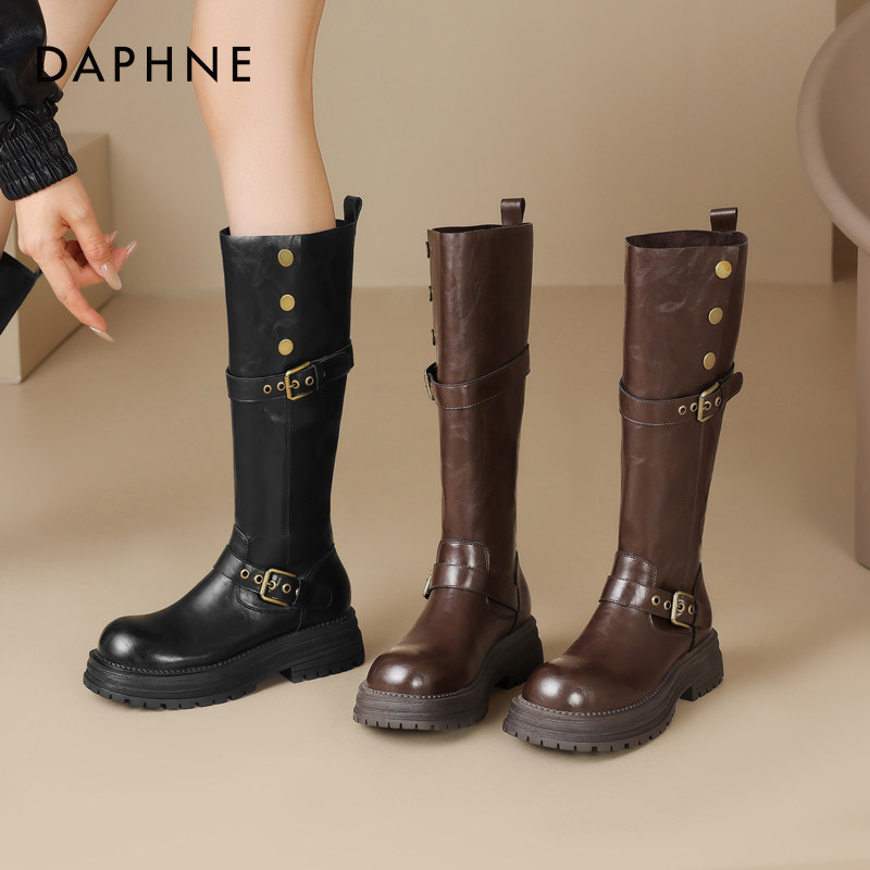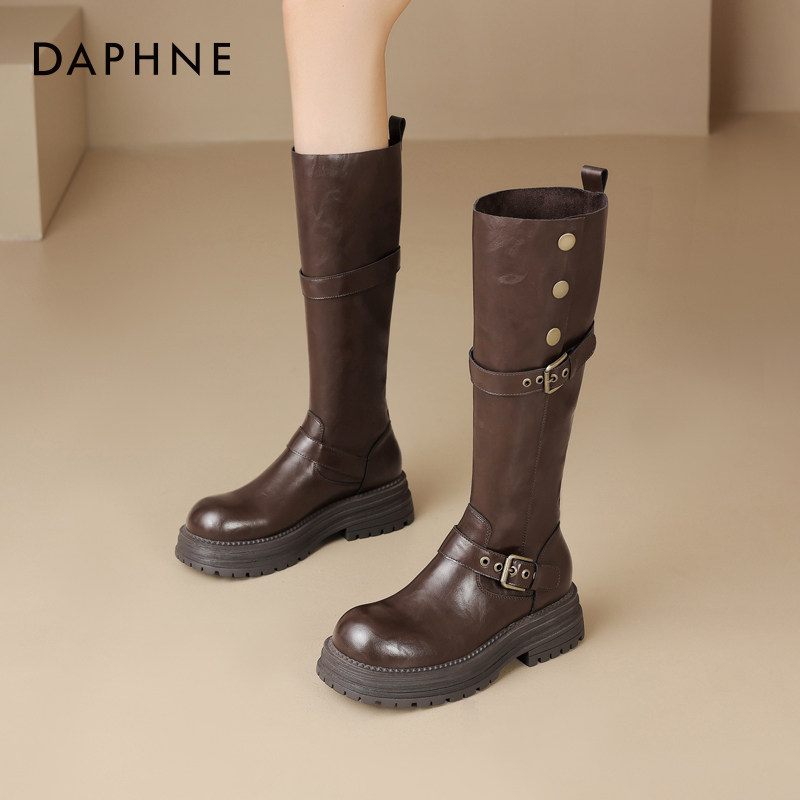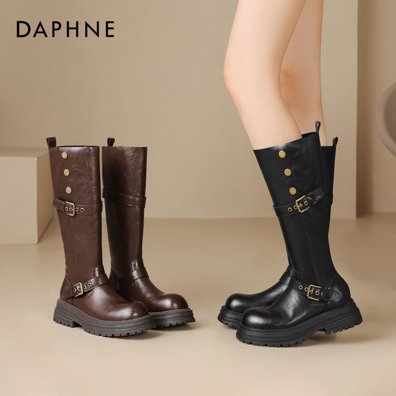 达芙妮棕色长筒靴女2026新款美拉德春款靴子春季厚底高筒骑士女靴