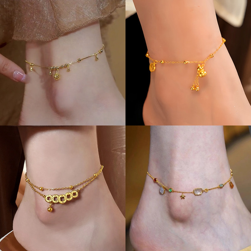 网红爆款碎碎冰五帝钱脚链加长版不掉色轻奢高级感配饰设计感新款