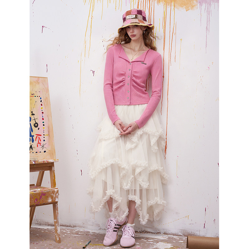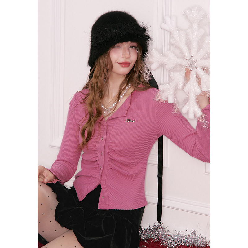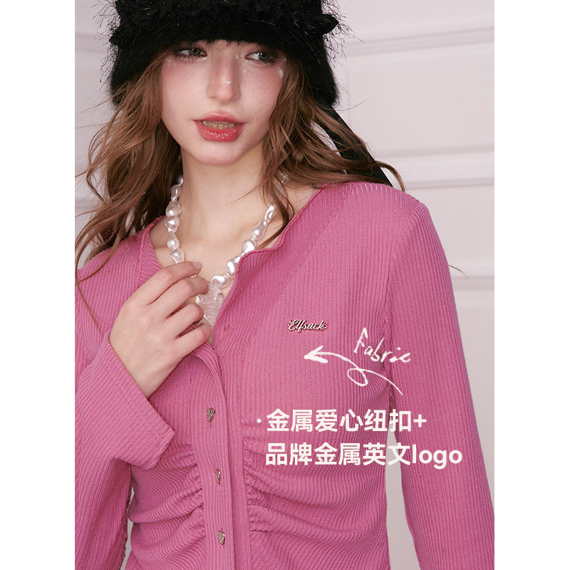 妖精的口袋粉色v领抽褶修身针织衫女2026早春新款显瘦内搭打底衫