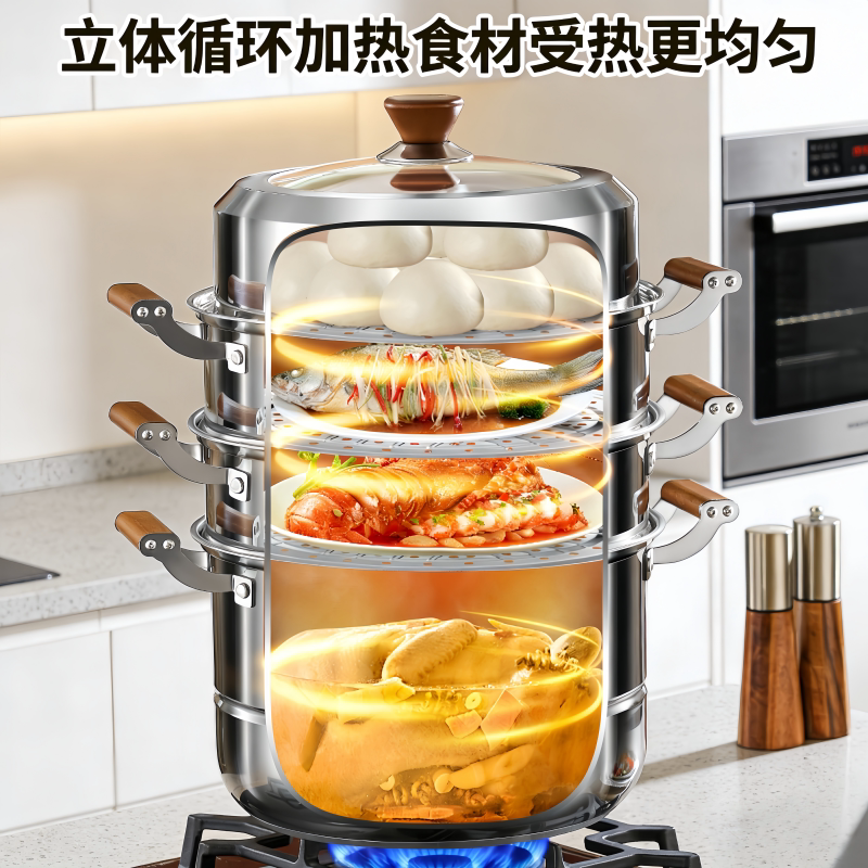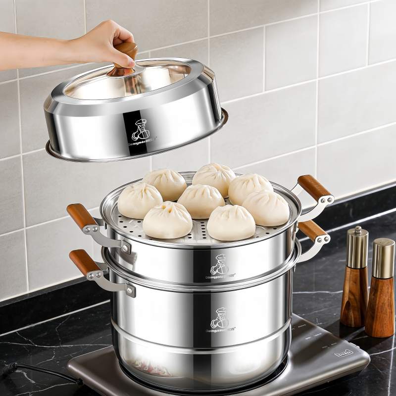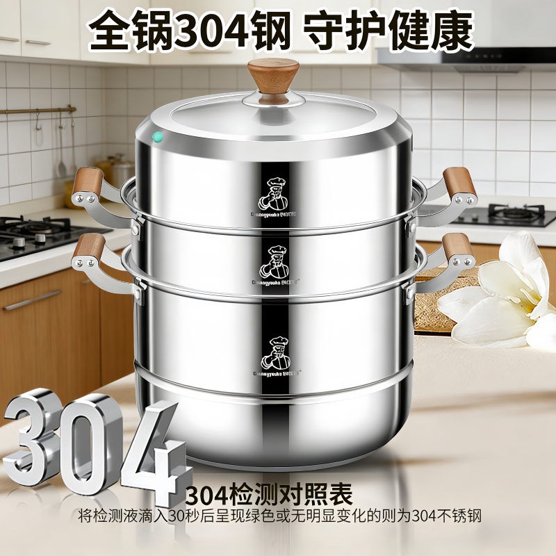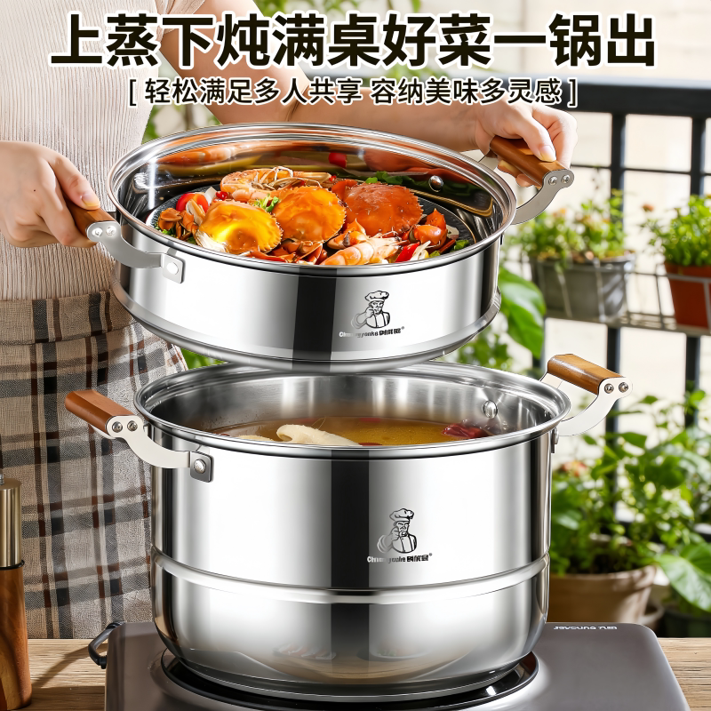 正品304不锈钢汤蒸锅食品级桃木柄家用加厚蒸笼屉大容量多层蒸锅