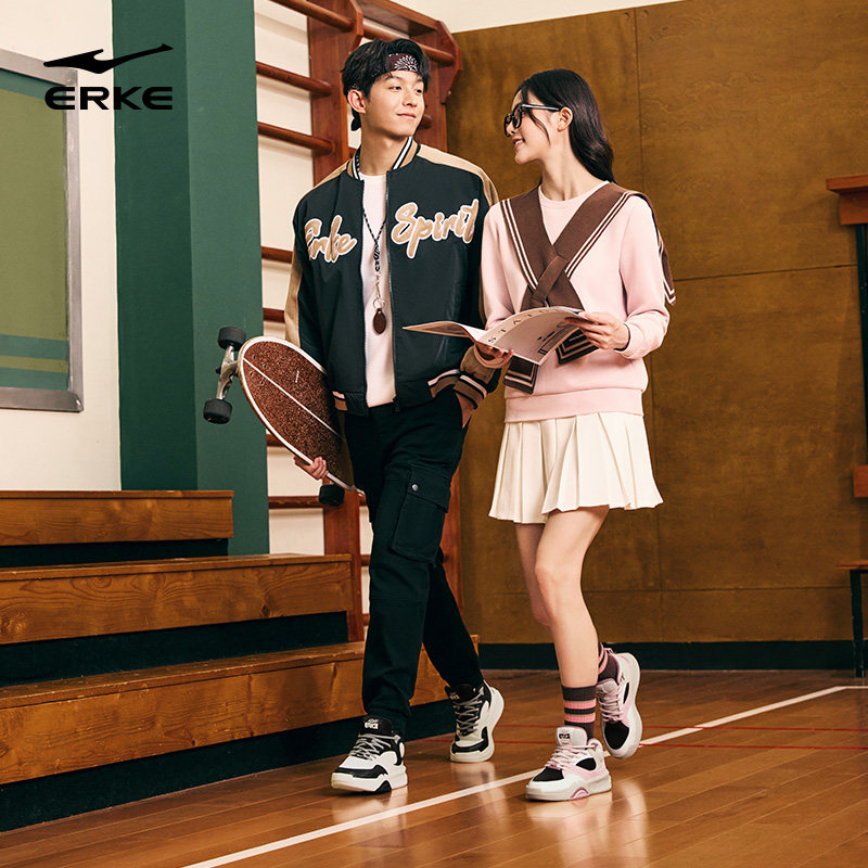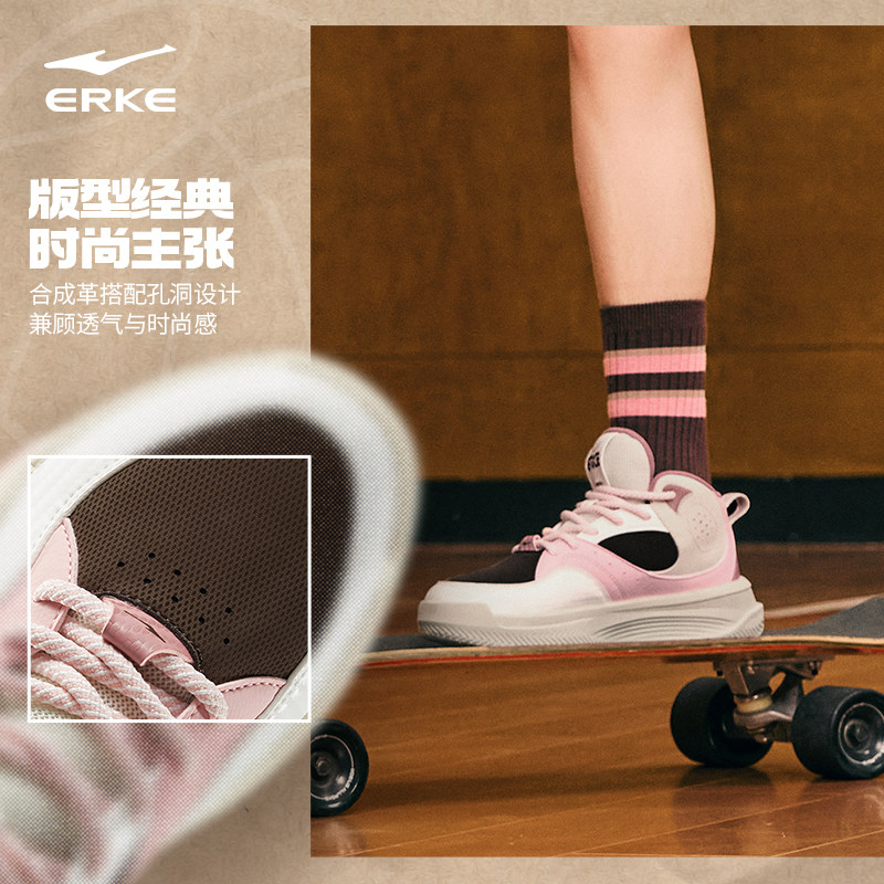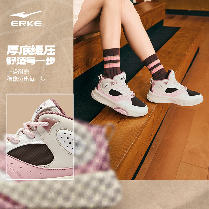 擎天鸿星尔克高帮女鞋篮球板鞋春季新款休闲鞋革面厚底粉色运动鞋