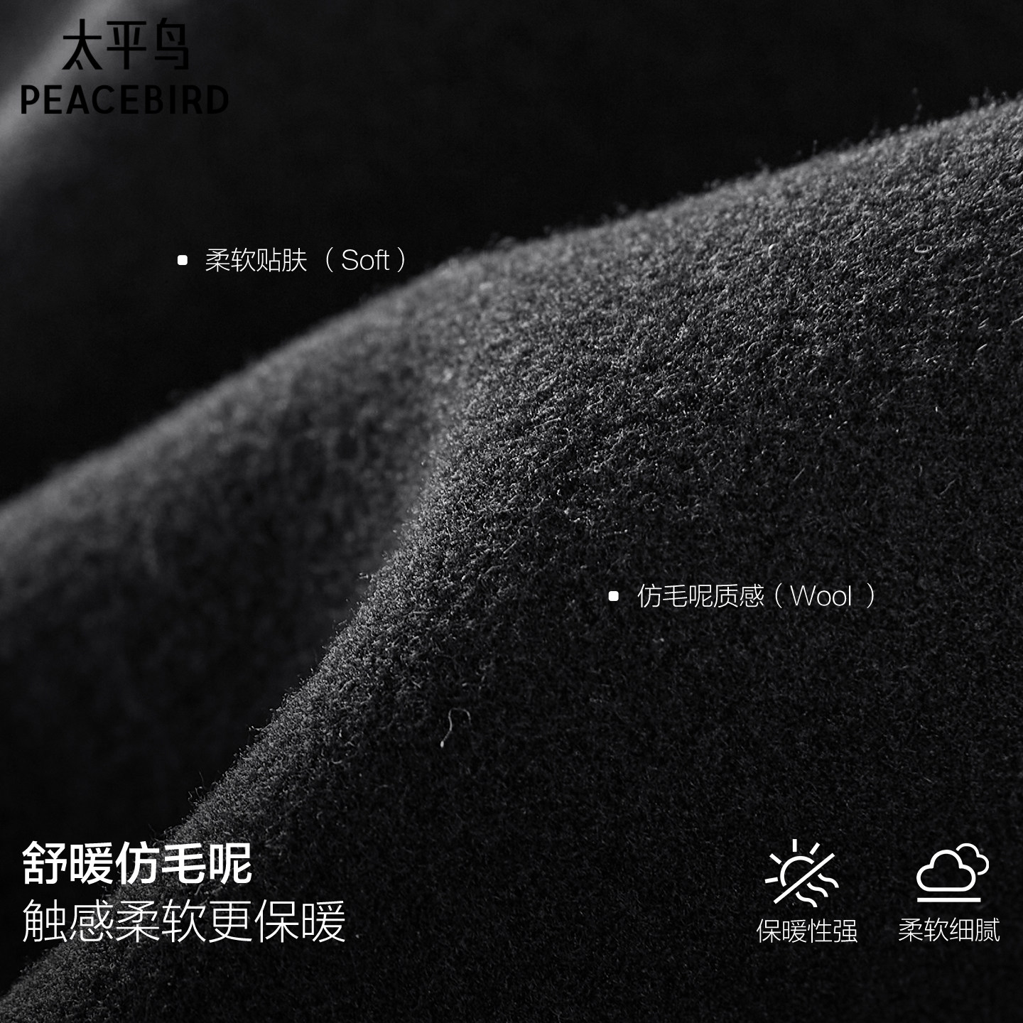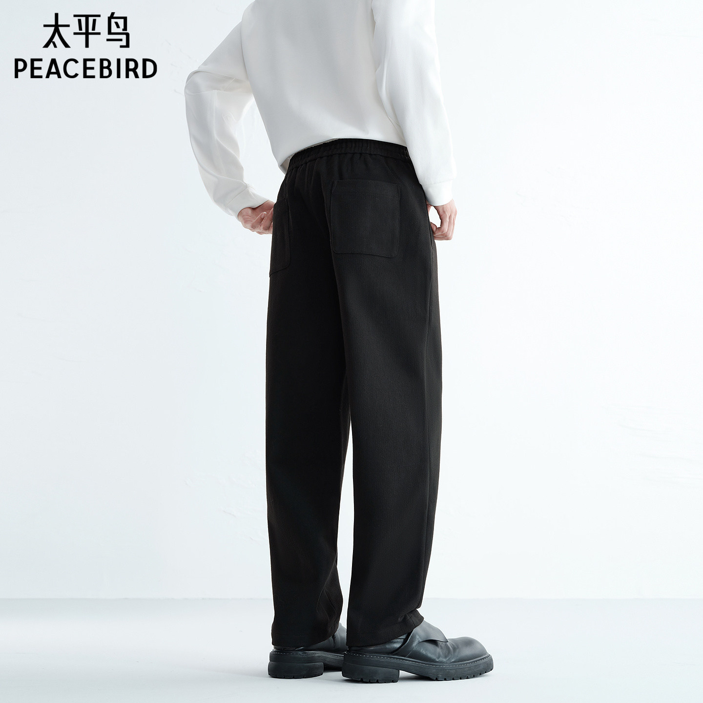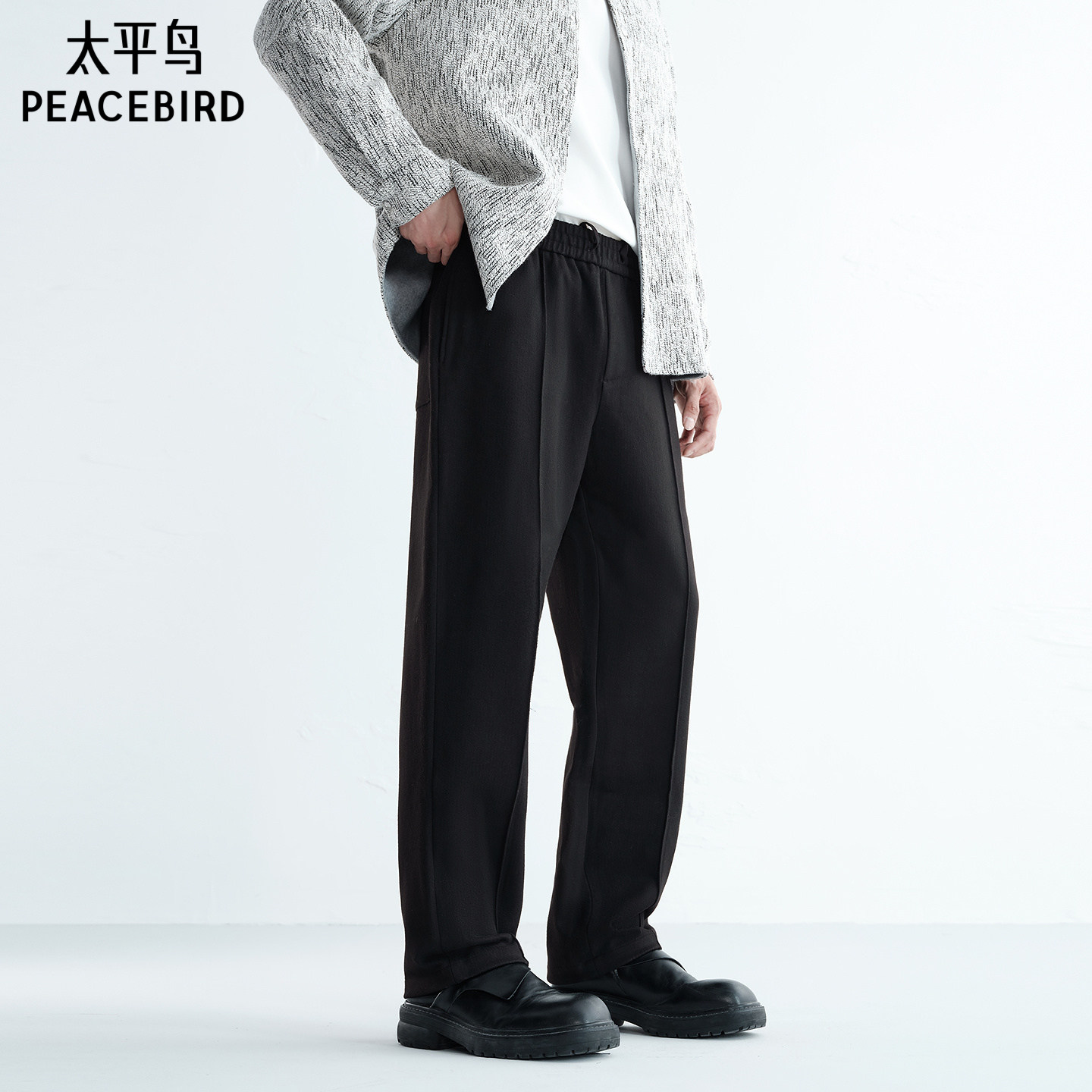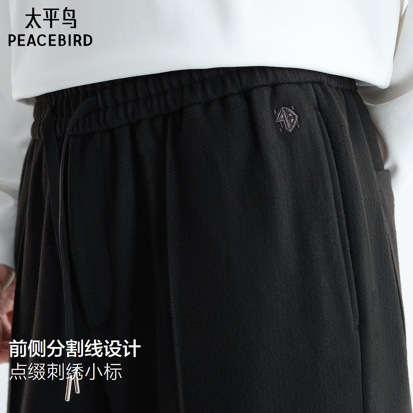 太平鸟男装 仿毛呢休闲裤男冬季新款保暖黑色抽绳直筒裤男百搭裤