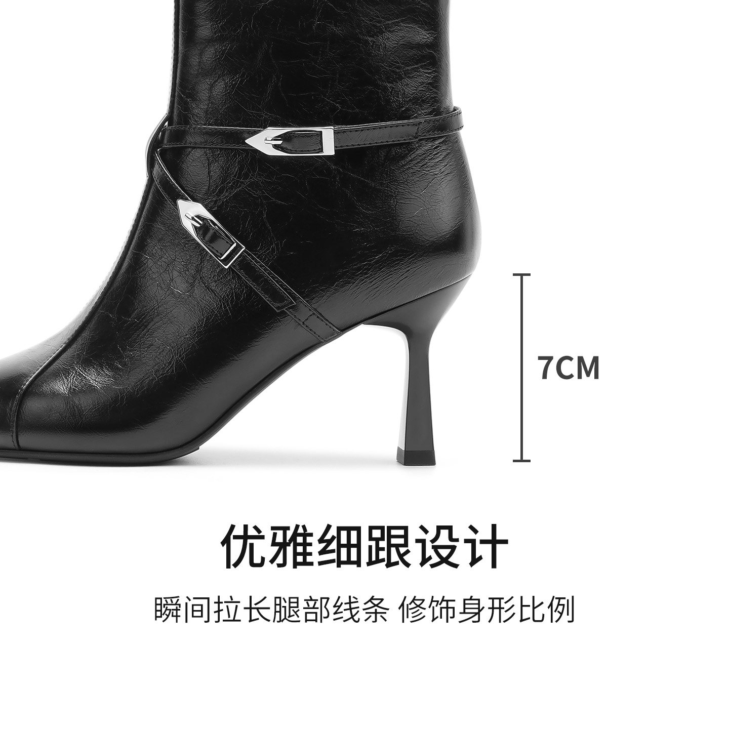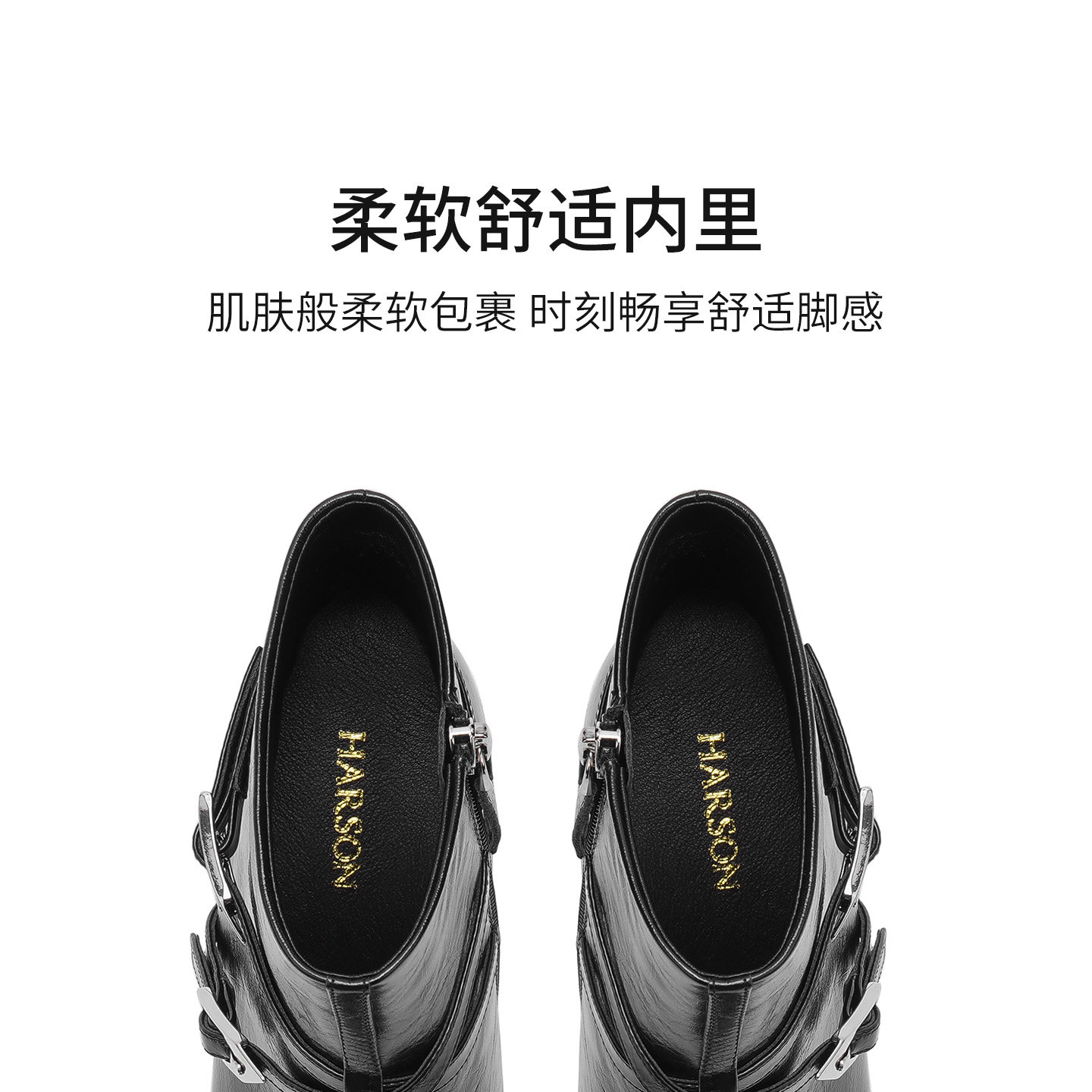 哈森气质尖头时尚皮带扣细高跟时装靴女短靴2025冬新品HWA250135