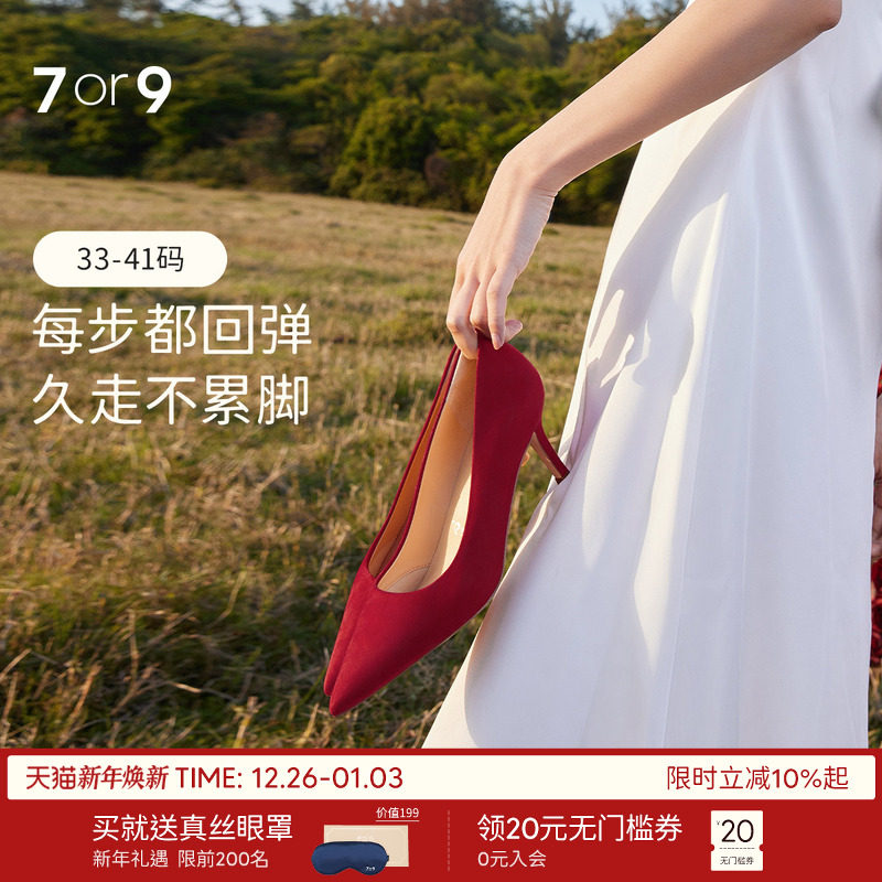 7or9婚鞋女鞋高跟鞋尖头细跟中式秀禾主婚纱新娘鞋浅口单鞋红山楂