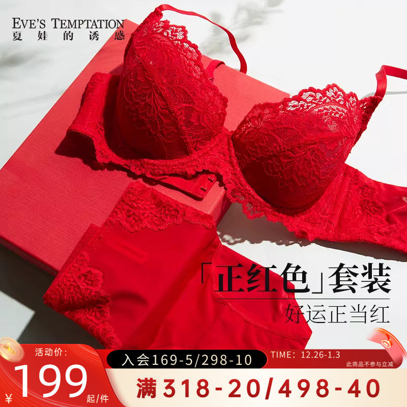 夏娃的诱惑本命年大红色内衣内裤女结婚新娘聚拢薄款蕾丝文胸套装