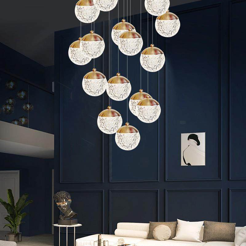 客厅中空大吊灯复式楼梯公寓挑高跃层loft别墅大厅旋转楼梯长吊灯