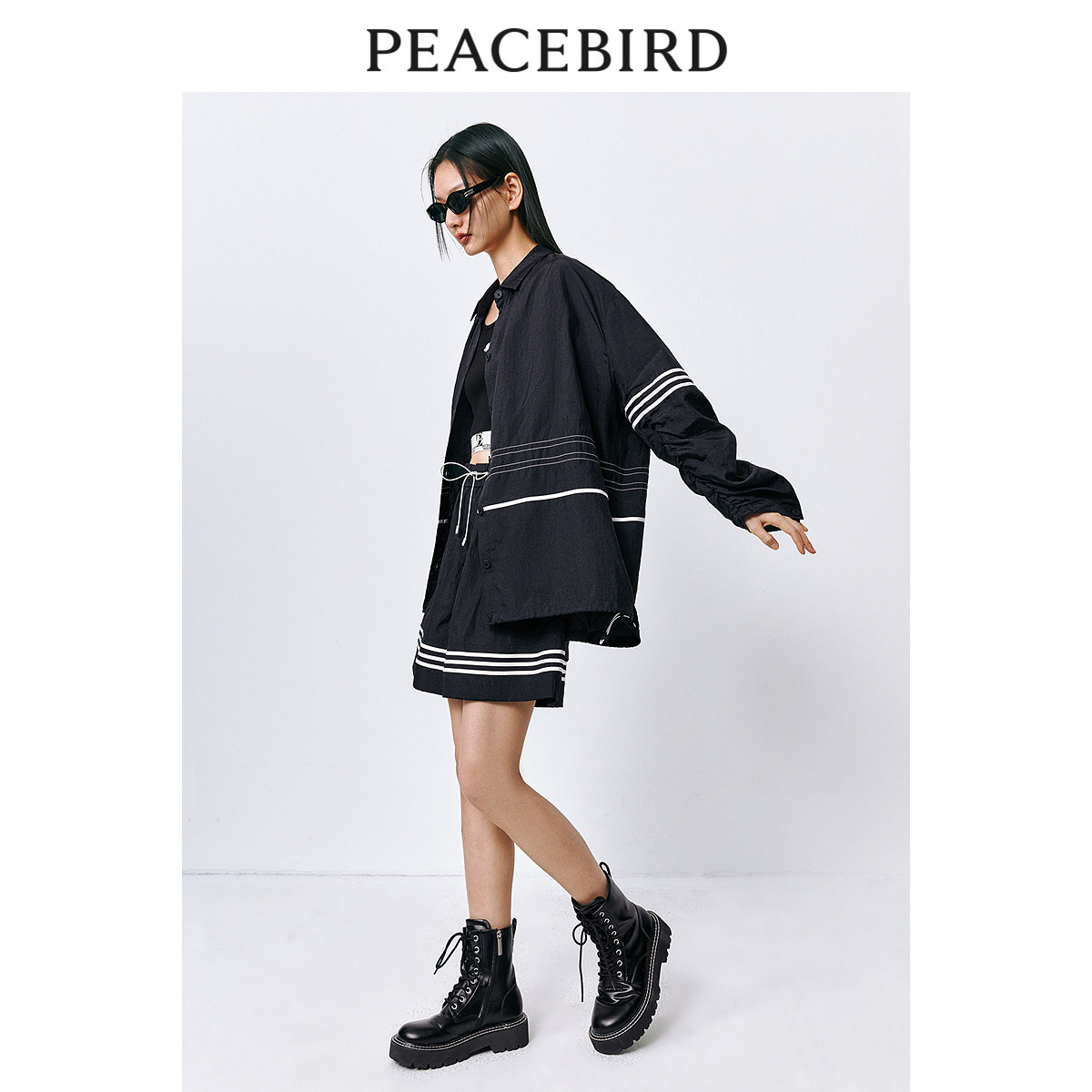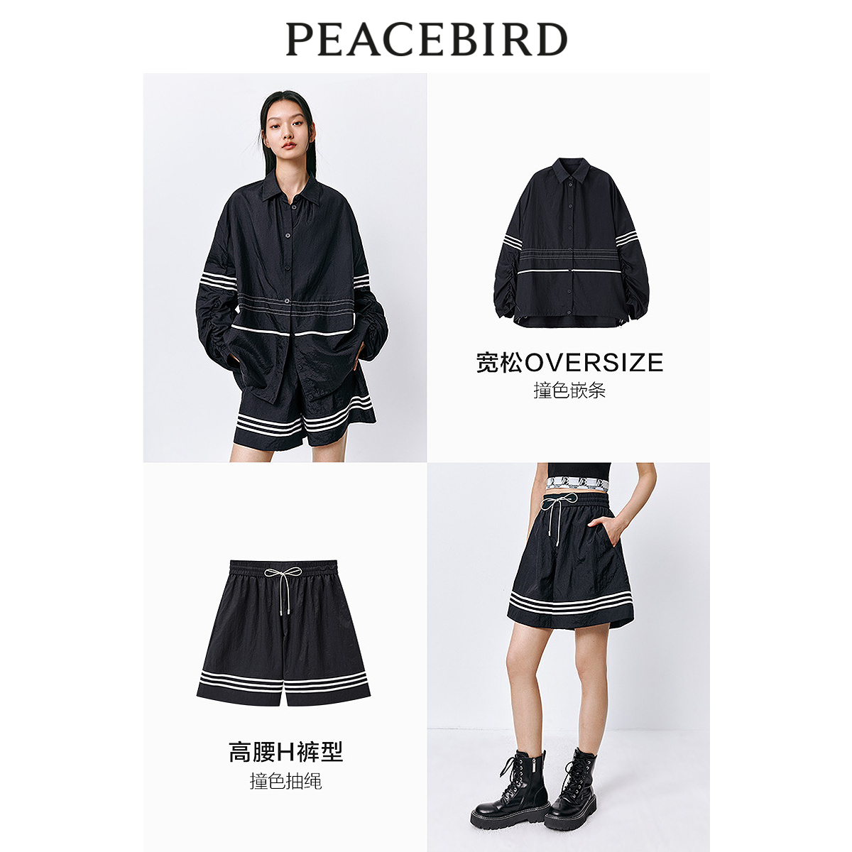 【断码秒杀】太平鸟微光泽肌理感长袖衬衫夏季撞色缎感衬衫套装